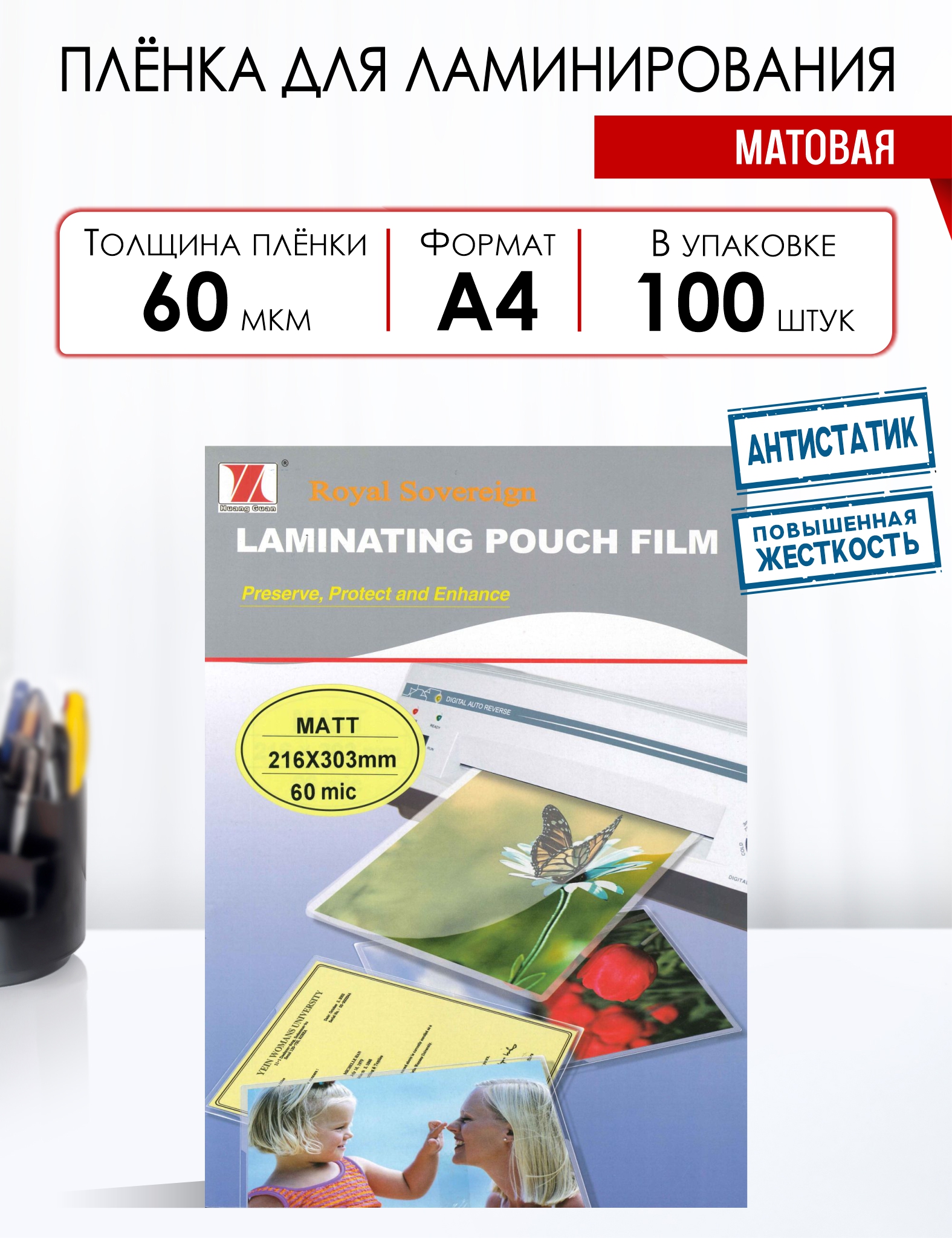 Основные характеристики: Размер пленки: 216х303мм; Толщина 60мкм; Состав пленки: РЕТ/LDPE/EVA - 25/0/35 мкм. Для ламинирования формата до А4; Антистатик; Бренд: Royal Sovereing Co.