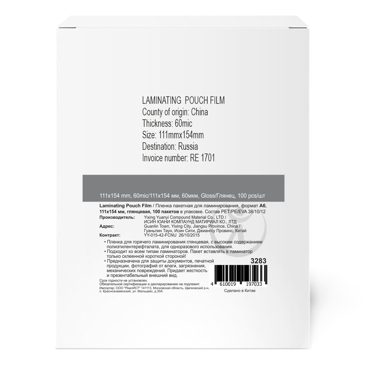 Пакетная пленка для горячего ламинирования, глянцевая, с высоким содержанием полиэтилентерефталата (PET). Формат А6, толщина 60мкм. В упаковке 100 пакетов. Каждый пакет состоит из 2-х пленок, склеенных между собой по короткой стороне (ламинационный пакет). Толщина каждой пленки - 60мкм, т. е. итоговая толщина заламинированного пакета - 120(60+60)мкм + толщина бумаги, которую Вы ламинируете.