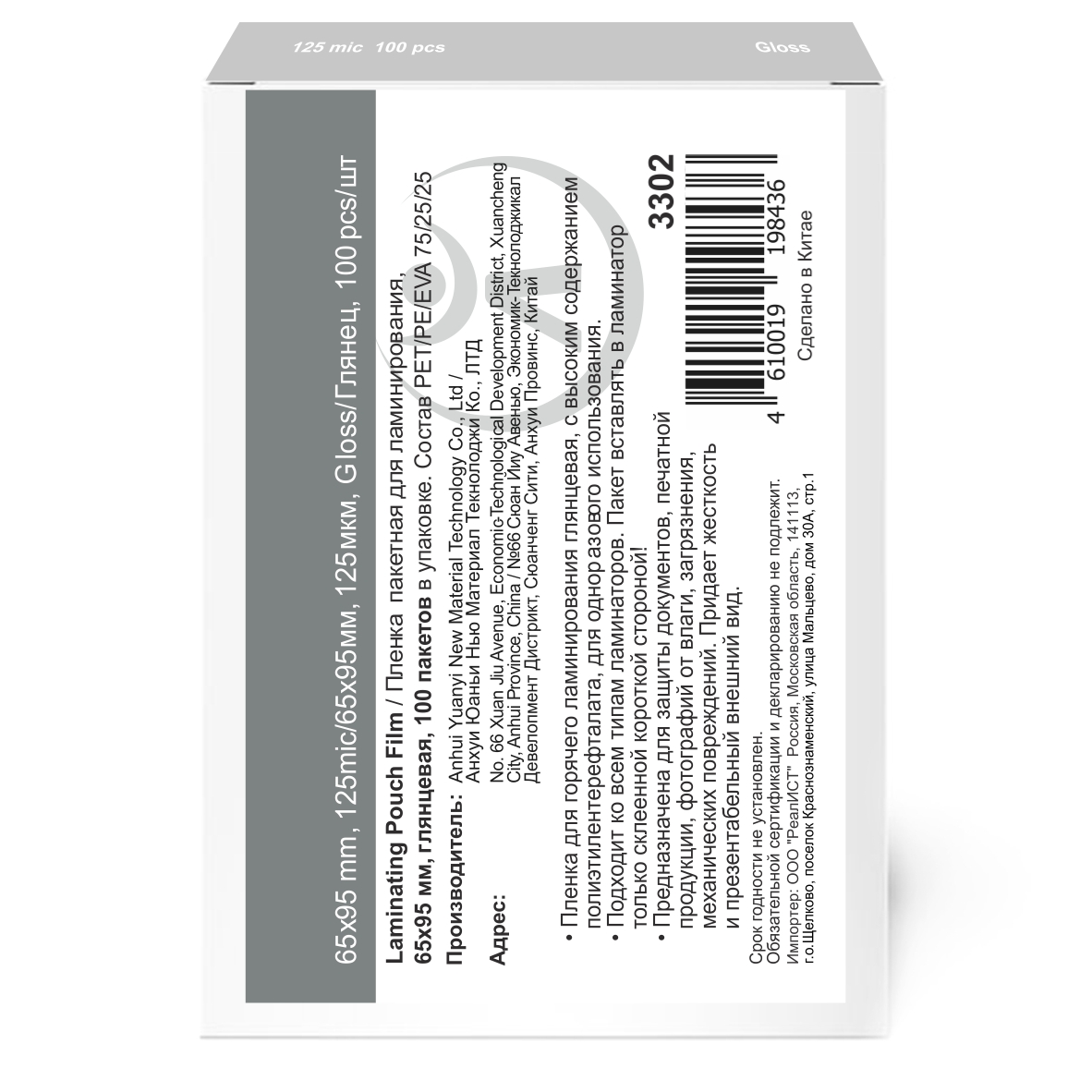 Пакетная пленка для горячего ламинирования, глянцевая, с высоким содержанием полиэтилентерефталата (PET). Толщина 125мкм. В упаковке 100 пакетов. Каждый пакет состоит из 2-х пленок, склеенных между собой по короткой стороне (ламинационный пакет). Толщина каждой пленки - 125мкм, т. е. итоговая толщина заламинированного пакета - 250(125+125)мкм + толщина бумаги, которую Вы ламинируете.