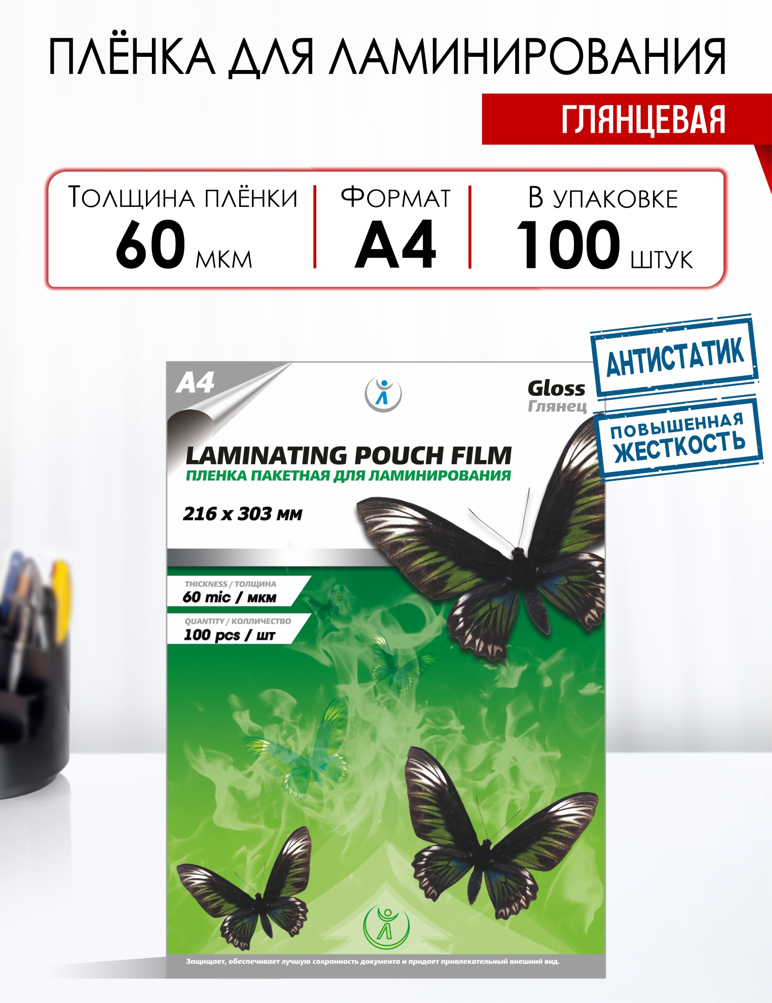 Основные характеристики: Размер пленки: 216х303мм; Толщина 60мкм; Состав пленки: РЕТ/LDPE/EVA - 38/0/22 мкм. Для ламинирования формата до А4; Антистатик; Бренд: LF.