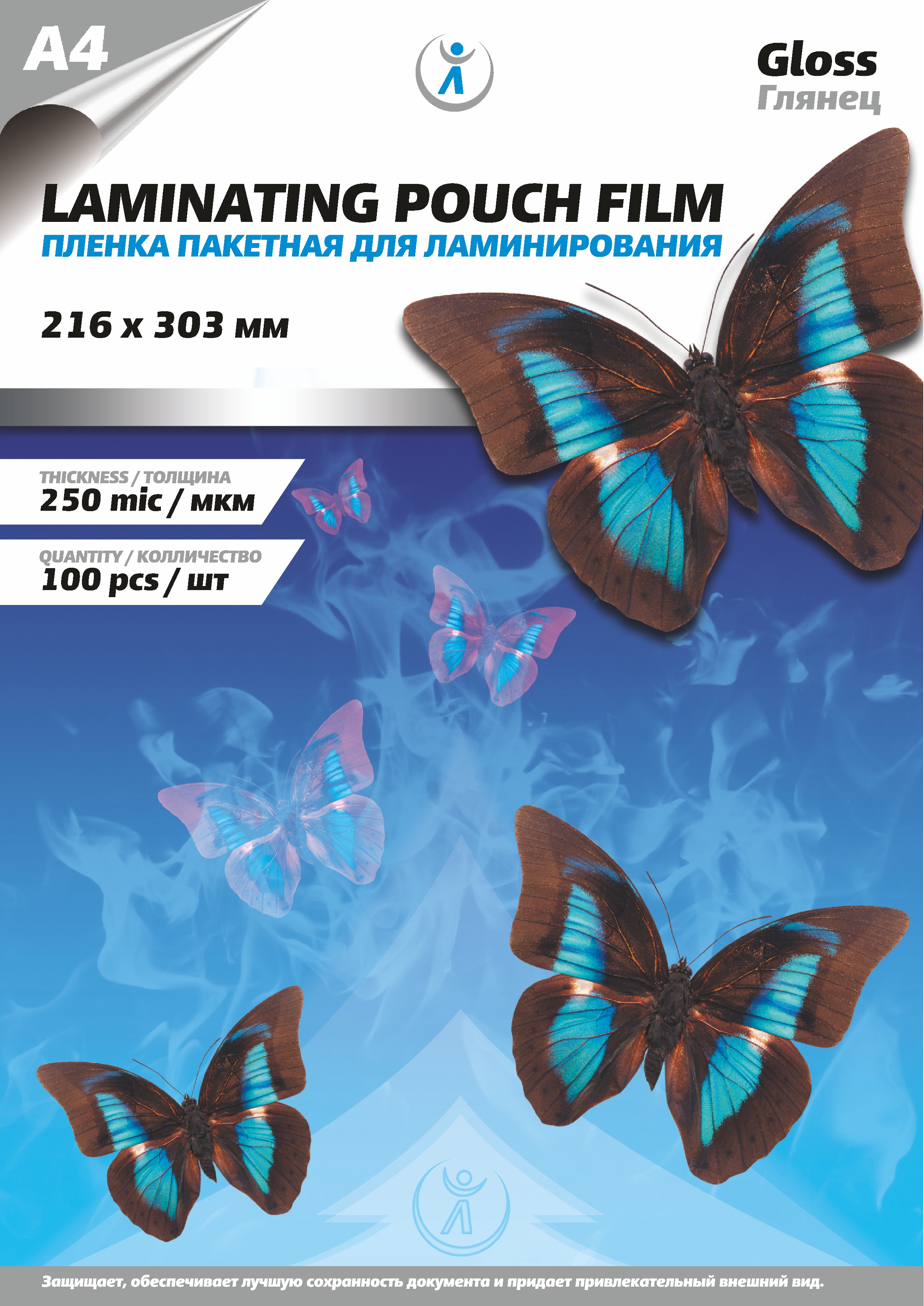 Пакетная пленка для горячего ламинирования, глянцевая, с высоким содержанием полиэтилентерефталата (PET). Формат А4, толщина 250мкм. В упаковке 100 пакетов. Каждый пакет состоит из 2-х пленок, склеенных между собой по короткой стороне (ламинационный пакет). Толщина каждой пленки - 250мкм, т. е. итоговая толщина заламинированного пакета - 500(250+250)мкм + толщина бумаги, которую Вы ламинируете.