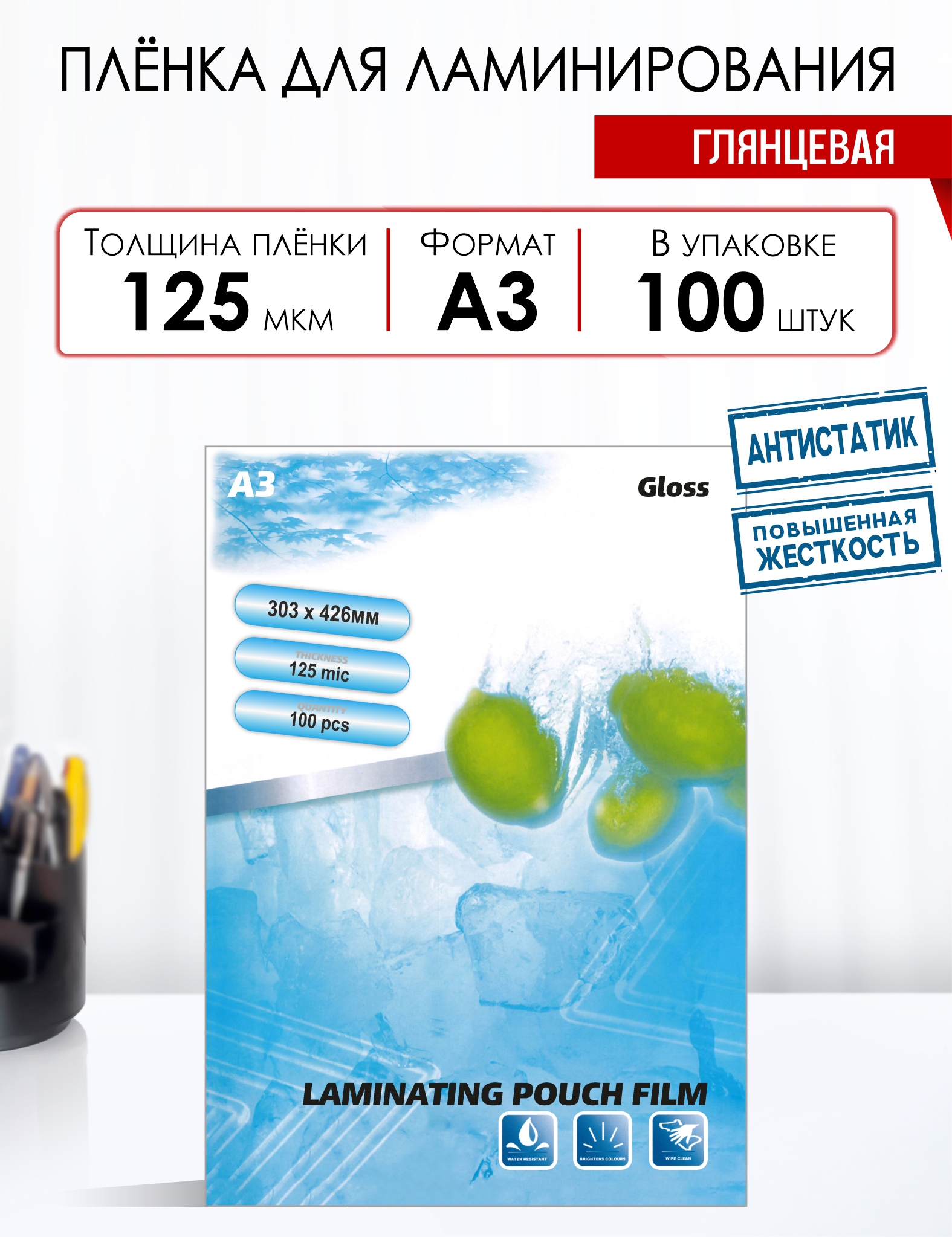 Пакетная пленка для горячего ламинирования, глянцевая, с высоким содержанием полиэтилентерефталата (PET). Формат А3, толщина 125мкм. В упаковке 100 пакетов. Каждый пакет состоит из 2-х пленок, склеенных между собой по короткой стороне (ламинационный пакет). Толщина каждой пленки - 125мкм, т. е. итоговая толщина заламинированного пакета - 250(125+125)мкм + толщина бумаги, которую Вы ламинируете.