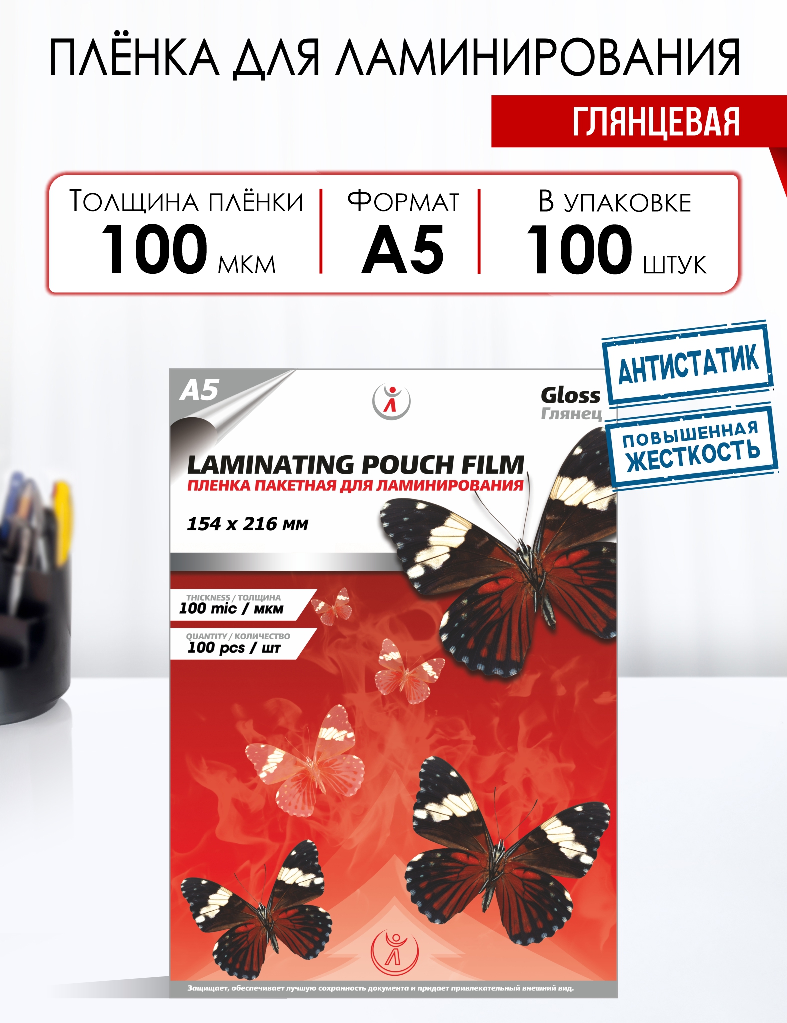 Пакетная пленка для горячего ламинирования, глянцевая, с высоким содержанием полиэтилентерефталата (PET). Формат А5, толщина 100мкм. В упаковке 100 пакетов. Каждый пакет состоит из 2-х пленок, склеенных между собой по короткой стороне (ламинационный пакет). Толщина каждой пленки - 100мкм, т. е. итоговая толщина заламинированного пакета - 200(100+100)мкм + толщина бумаги, которую Вы ламинируете.