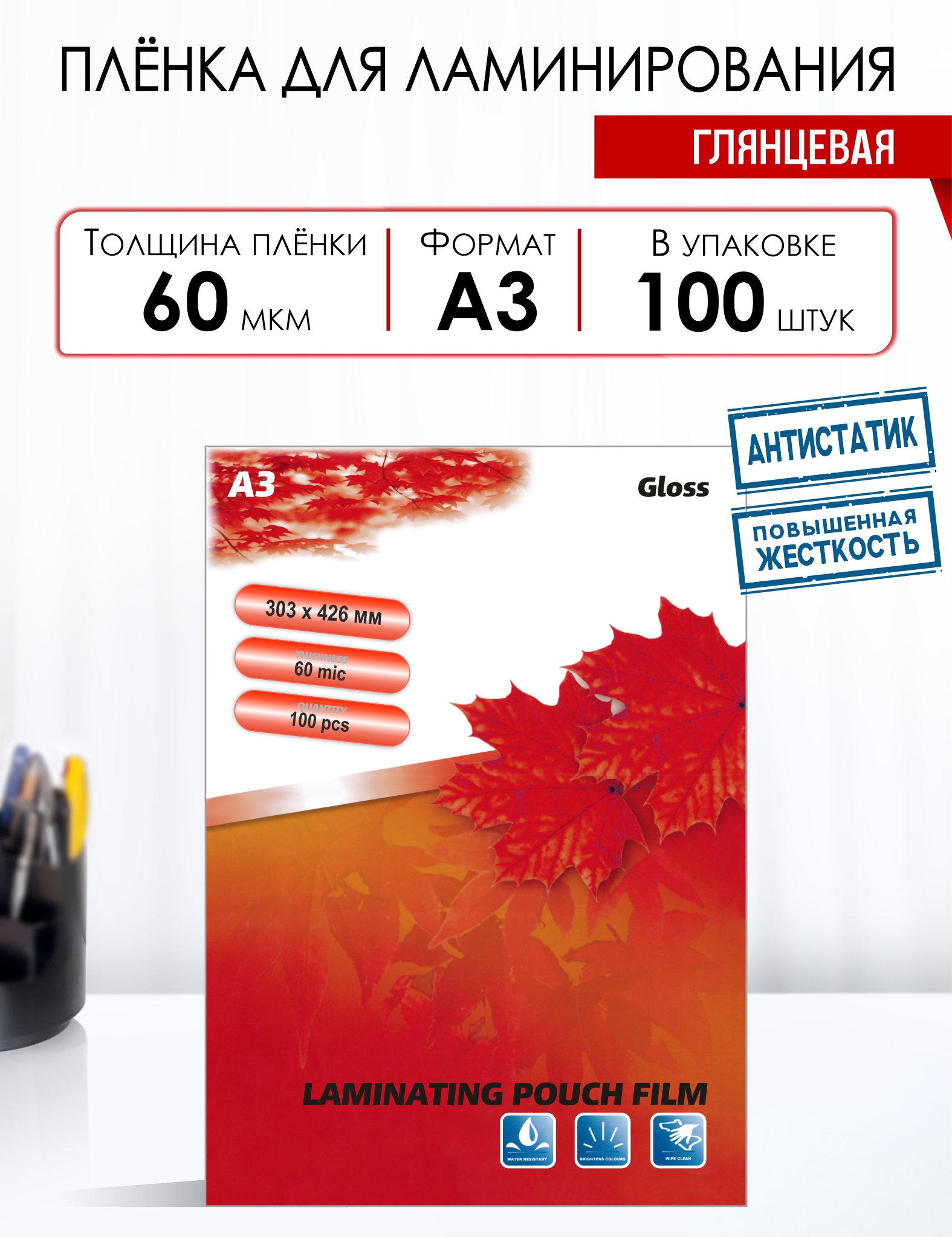 Пакетная пленка для горячего ламинирования, глянцевая, с высоким содержанием полиэтилентерефталата (PET). Формат А3, толщина 60мкм. В упаковке 100 пакетов. Каждый пакет состоит из 2-х пленок, склеенных между собой по короткой стороне (ламинационный пакет). Толщина каждой пленки - 60мкм, т. е. итоговая толщина заламинированного пакета - 120(60+60)мкм + толщина бумаги, которую Вы ламинируете.