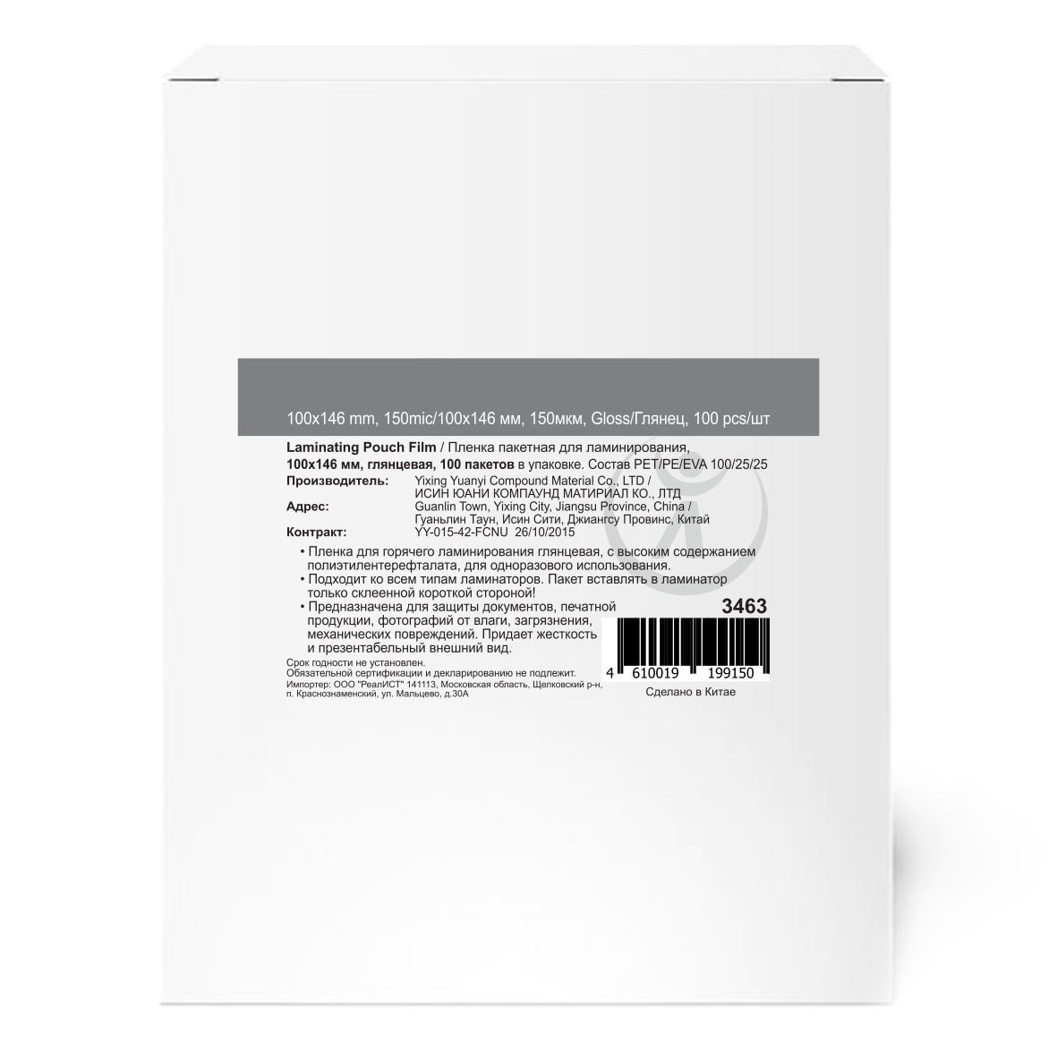 Пакетная пленка для горячего ламинирования, глянцевая, с высоким содержанием полиэтилентерефталата (PET). Толщина 150мкм. В упаковке 100 пакетов. Каждый пакет состоит из 2-х пленок, склеенных между собой по короткой стороне (ламинационный пакет). Толщина каждой пленки - 150мкм, т. е. итоговая толщина заламинированного пакета - 300(150+150)мкм + толщина бумаги, которую Вы ламинируете.