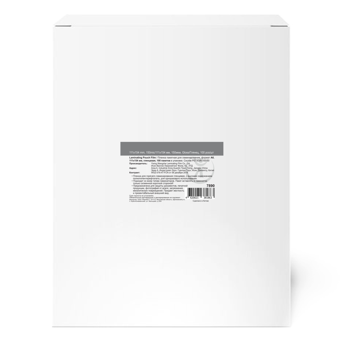 Пакетная пленка для ламинирования, глянцевая, 111x154мм (А6), 150мкм, WF
