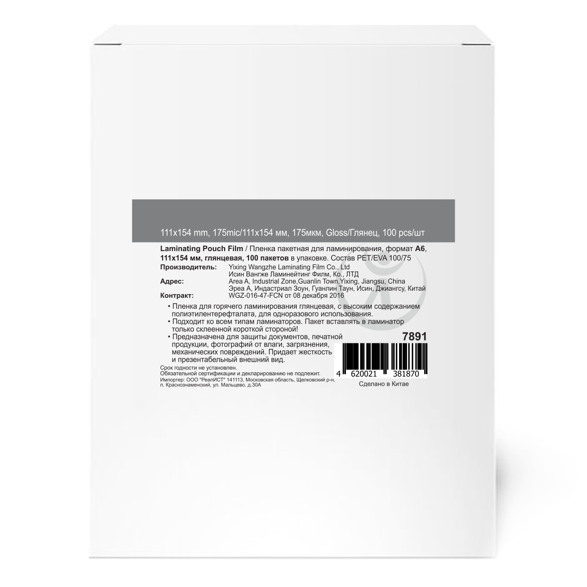 Пакетная пленка для ламинирования, глянцевая, 111x154мм (А6), 175мкм, WF