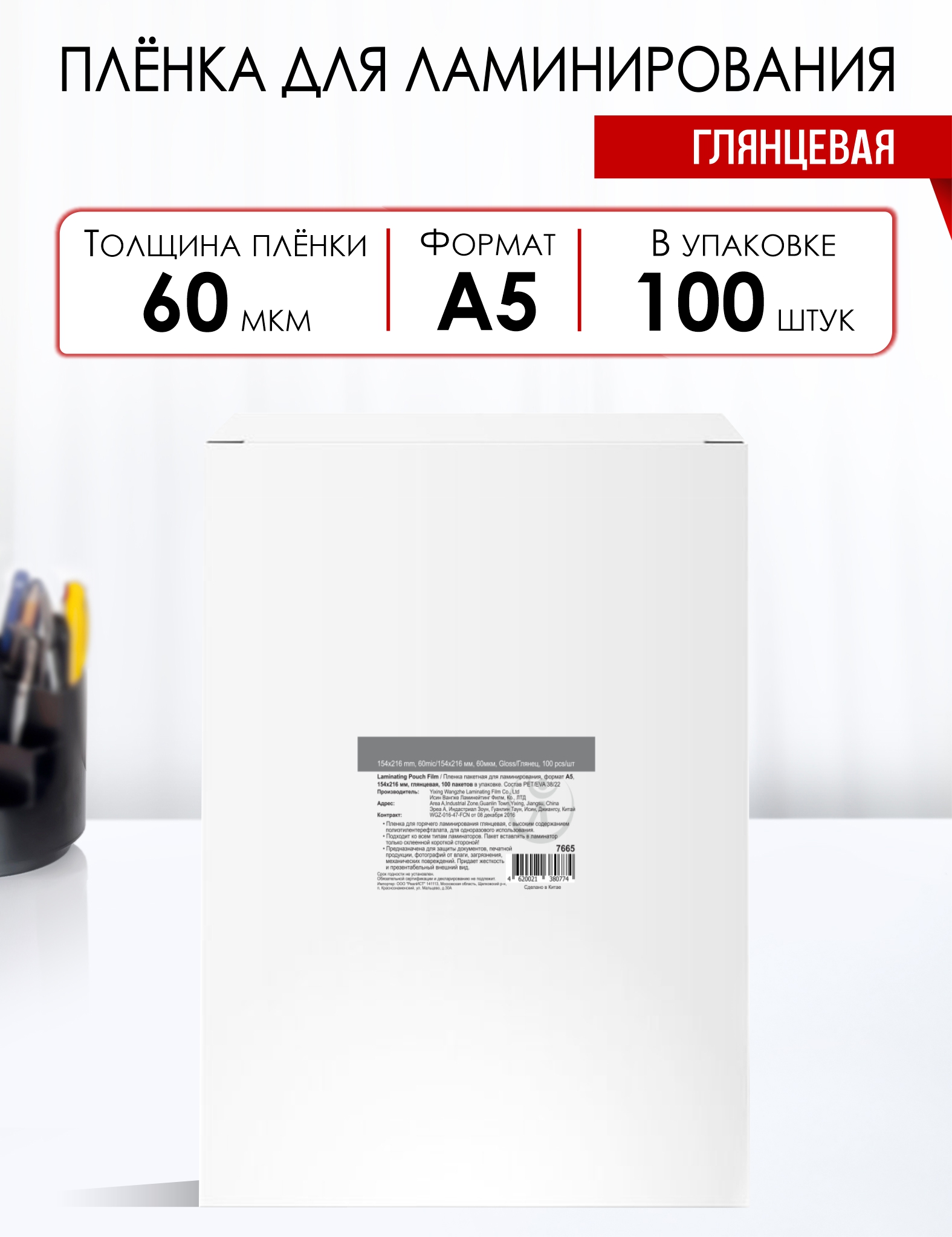 Пакетная пленка для горячего ламинирования, глянцевая, с высоким содержанием полиэтилентерефталата (PET). Формат А5, толщина 60мкм. В упаковке 100 пакетов. Каждый пакет состоит из 2-х пленок, склеенных между собой по короткой стороне (ламинационный пакет). Толщина каждой пленки - 60мкм, т. е. итоговая толщина заламинированного пакета - 120(60+60)мкм + толщина бумаги, которую Вы ламинируете.