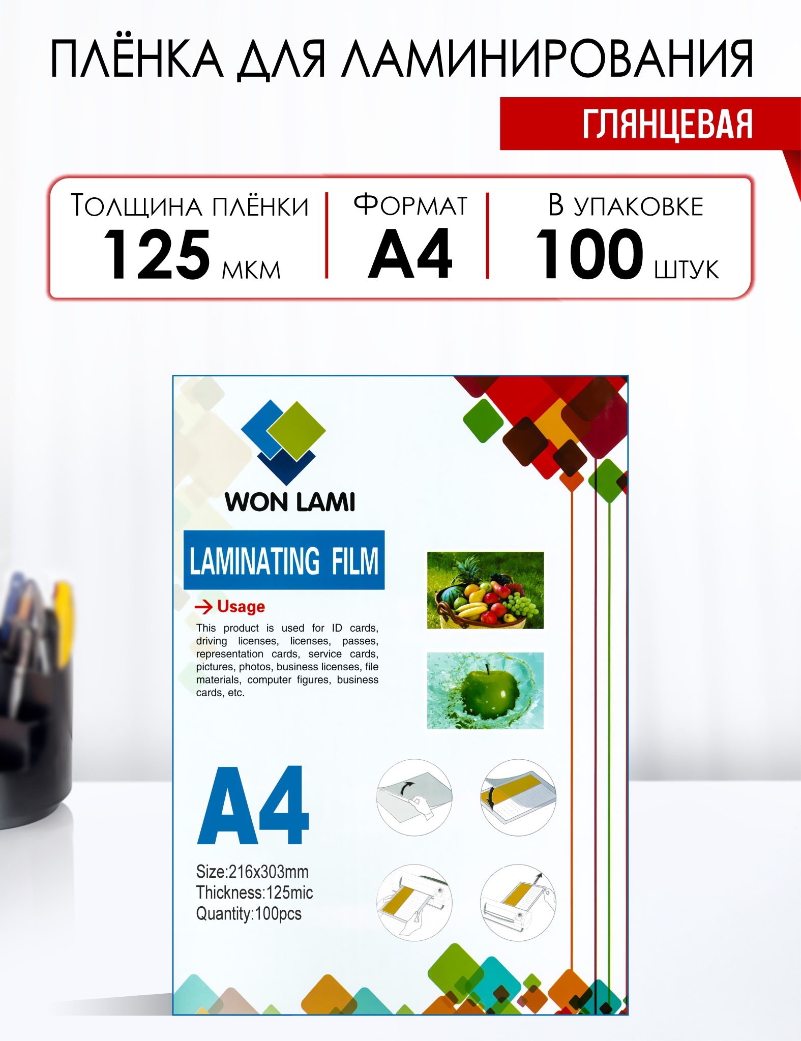 Основные характеристики: Размер пленки: 216х303мм; Толщина 125мкм; Состав пленки: РЕТ/LDPE/EVA - 75/0/50 мкм. Для ламинирования формата до А4; Бренд: WON LAMI.