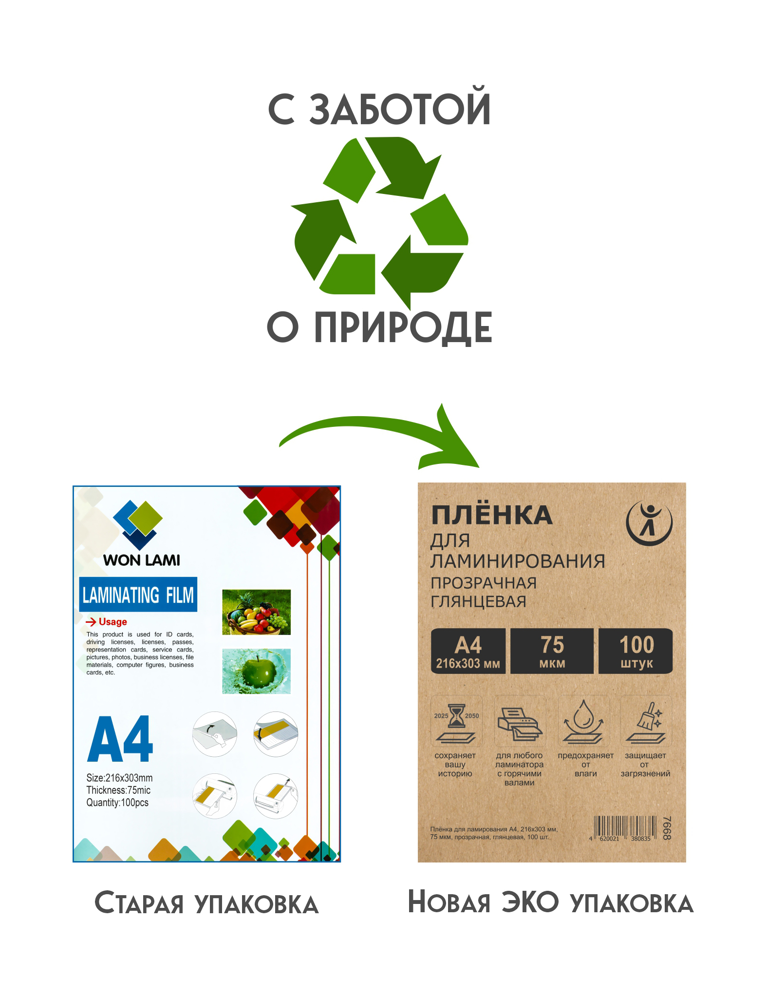 Основные характеристики: Размер пленки: 216х303мм; Толщина 75мкм; Состав пленки: РЕТ/LDPE/EVA - 38/0/37 мкм. Для ламинирования формата до А4; Бренд: WON LAMI.