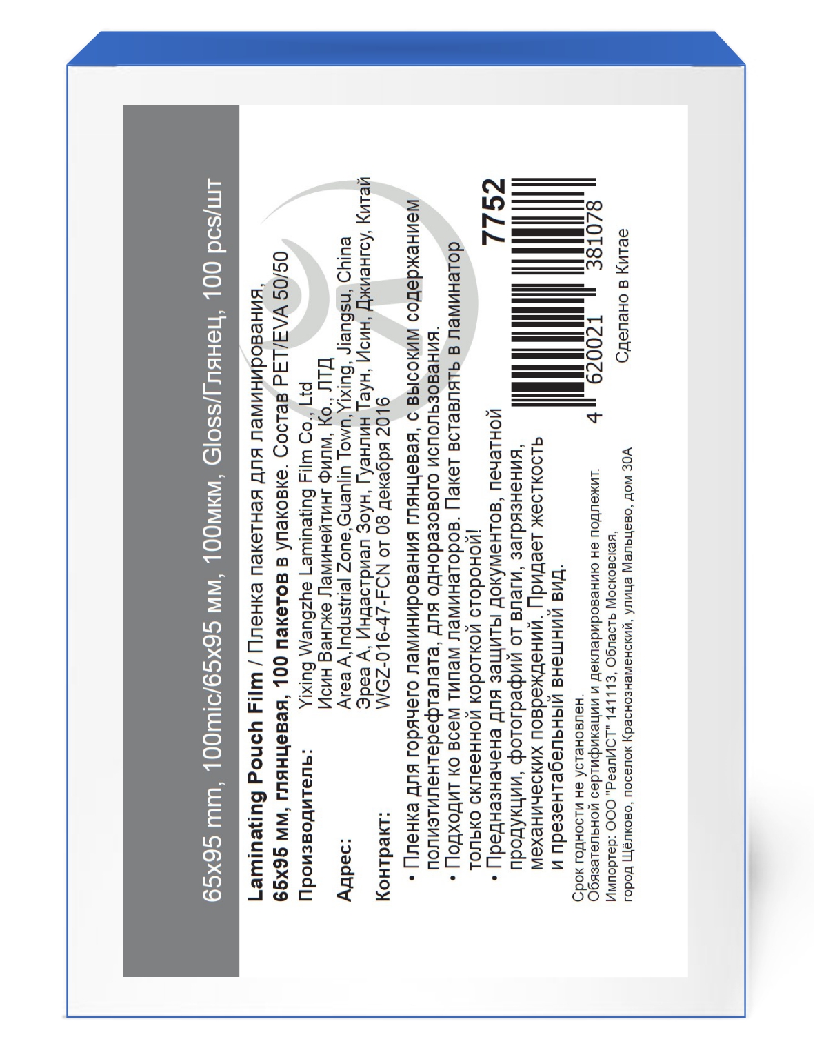 Основные характеристики: Размер пленки: 65х95мм; Толщина 100мкм; Состав пленки: РЕТ/LDPE/EVA — 50/0/50 мкм. Бренд: WON LAMI.