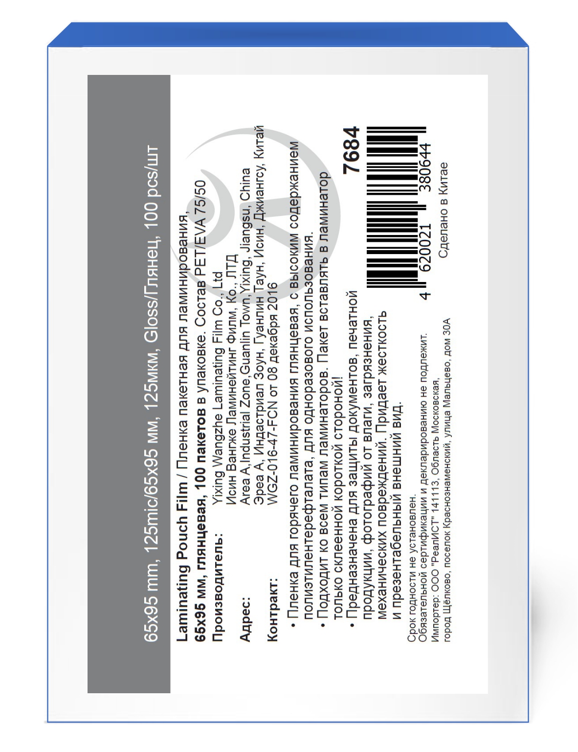 Основные характеристики: Размер пленки: 65х95мм; Толщина 125мкм; Состав пленки: РЕТ/LDPE/EVA — 75/0/50 мкм. Бренд: WON LAMI.