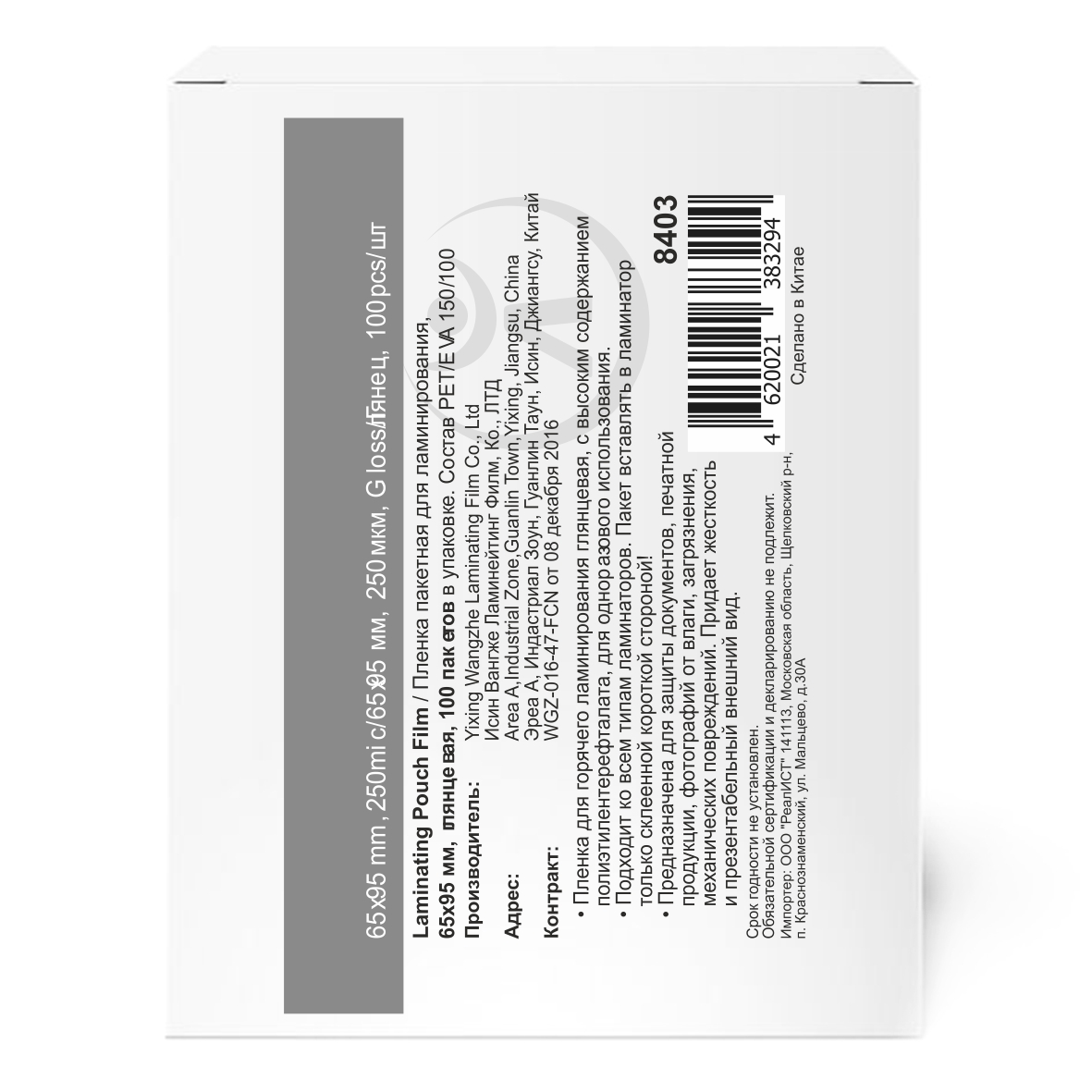 Основные характеристики: Размер пленки: 65х95мм; Толщина 250мкм; Состав пленки: РЕТ/LDPE/EVA — 150/0/100 мкм. Бренд: WON LAMI.