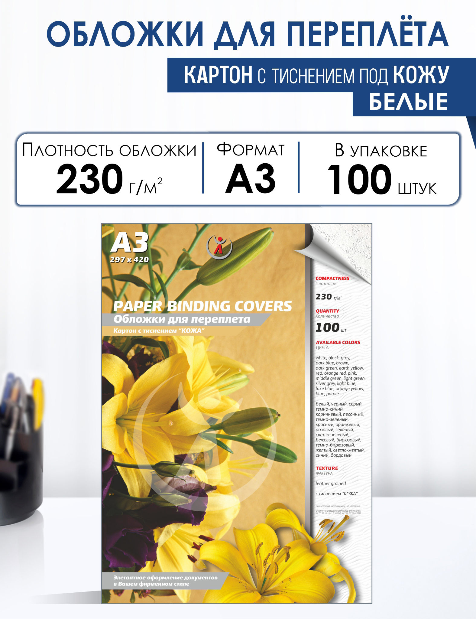 Обложка для переплета картонная используется при брошюровке документов чаще всего как нижняя обложка. Картонная обложка для переплета хорошо защищает страницы бумаги от пыли и грязи, придает документу более строгий и презентабельный вид. Поверхность обложки имитирует текстуру кожи , обложка шероховатая и приятная на ощупь, ее удобно держать в руках. Цвет обложки: Белый. Обложка жесткая, ее плотность 230 г/м2. Формат обложек А3. В одной упаковке 100 штук обложек. Подходит ко всем типам брошюраторов и переплетных машин.