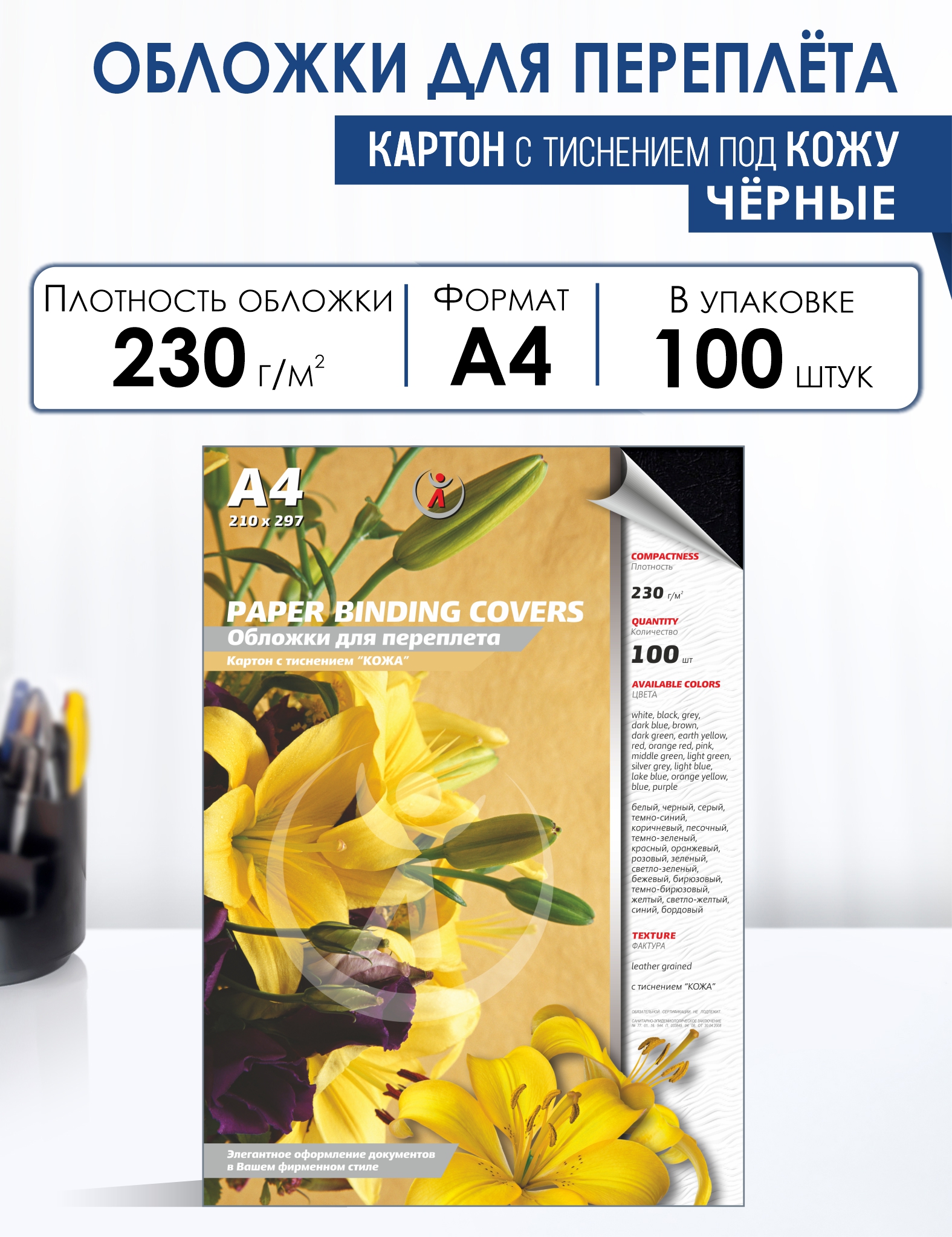 Обложка для переплета картонная используется при брошюровке документов чаще всего как нижняя обложка. Картонная обложка для переплета хорошо защищает страницы бумаги от пыли и грязи, придает документу более строгий и презентабельный вид. Поверхность обложки имитирует текстуру кожи , обложка шероховатая и приятная на ощупь, ее удобно держать в руках. Цвет обложки: Черный. Обложка жесткая, ее плотность 230 г/м2. Формат обложек А4. В одной упаковке 100 штук обложек. Подходит ко всем типам брошюраторов и переплетных машин.