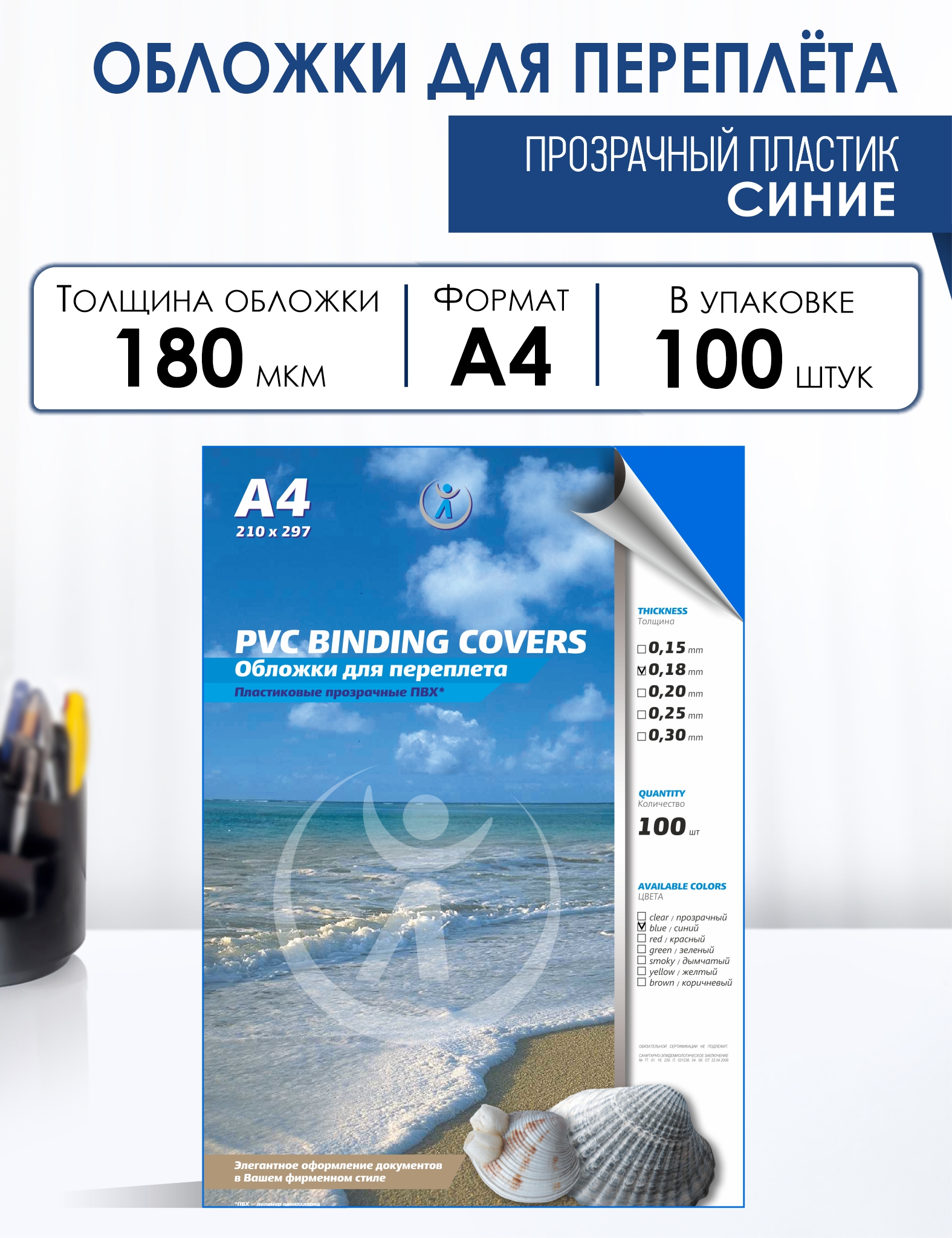 Обложка для переплета пластиковая прозрачная используется при брошюровке документов чаще всего как верхняя обложка. Пластиковая обложка для переплета хорошо защищает страницы от пыли и грязи, придает документу более строгий и презентабельный вид. Эта обложка прозрачная, синяя, поэтому через нее будет виден текст, напечатанный на листе бумаги, на котором лежит обложка. Толщина обложки 0,18мм. Формат А4. В одной упаковке 100 штук обложек. Материал обложки ПВХ (поливинилхлорид). Подходит ко всем типам брошюраторов и переплетных машин.