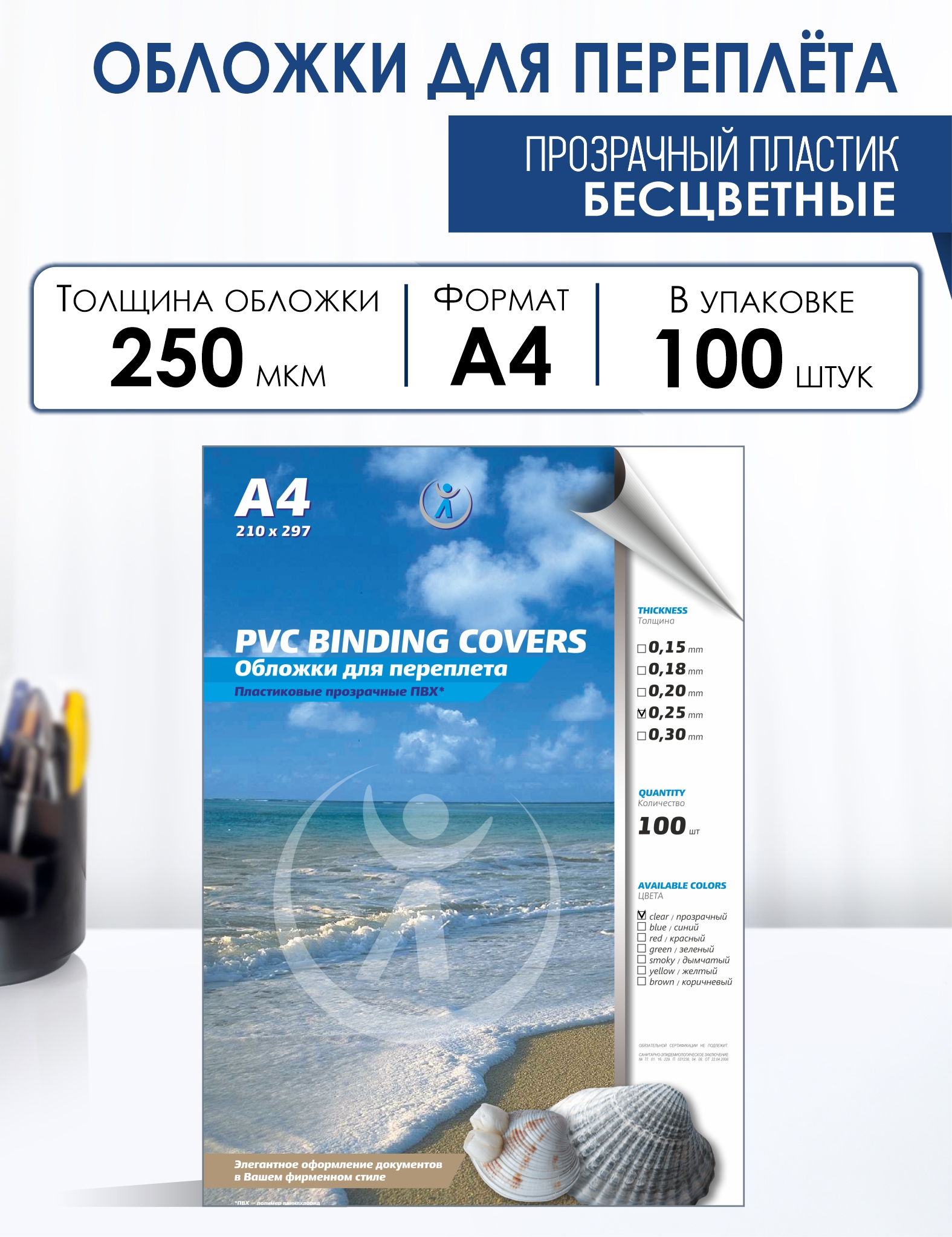 Обложка для переплета пластиковая прозрачная используется при брошюровке документов чаще всего как верхняя обложка. Пластиковая обложка для переплета хорошо защищает страницы от пыли и грязи, придает документу более строгий и презентабельный вид. Эта обложка прозрачная, бесцветная, поэтому через нее будет виден текст, напечатанный на листе бумаги, на котором лежит обложка. Толщина обложки 0,25мм. Формат А4. В одной упаковке 100 штук обложек. Материал обложки ПВХ (поливинилхлорид). Подходит ко всем типам брошюраторов и переплетных машин.