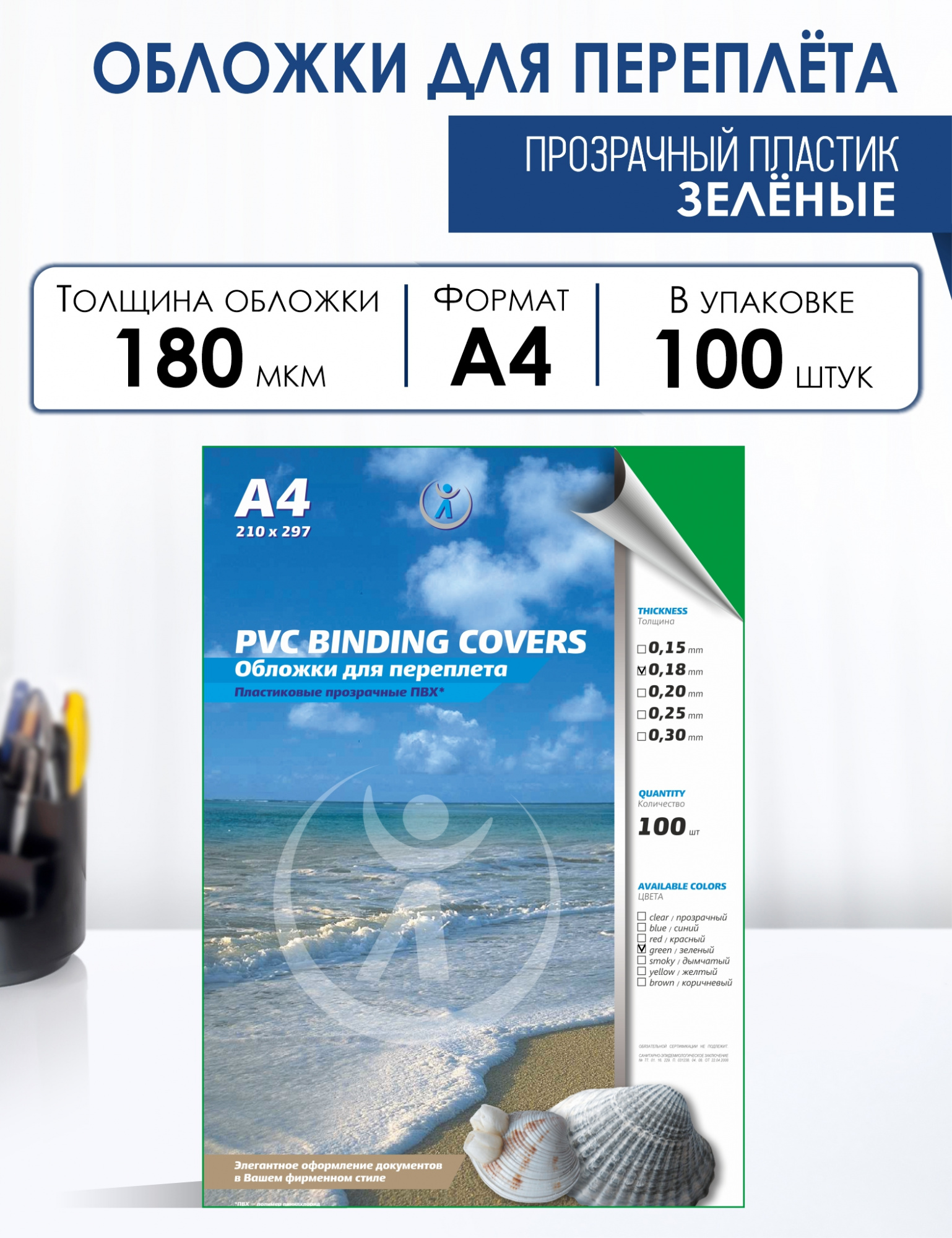 Обложки для переплета ПВХ прозрачные, 0,18мм, А4, зеленый, ST