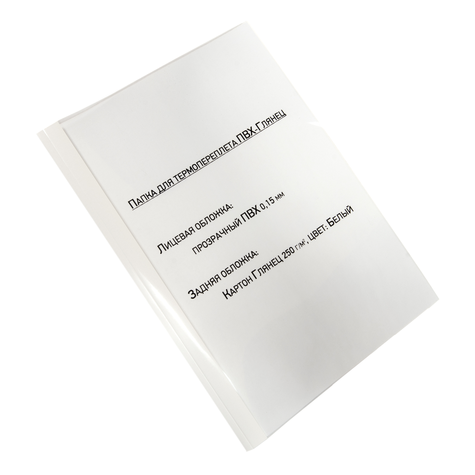 Обложки: верх - ПВХ А4 0,15мм прозрачные; низ - Картон глянец белый 250г/м2. |
