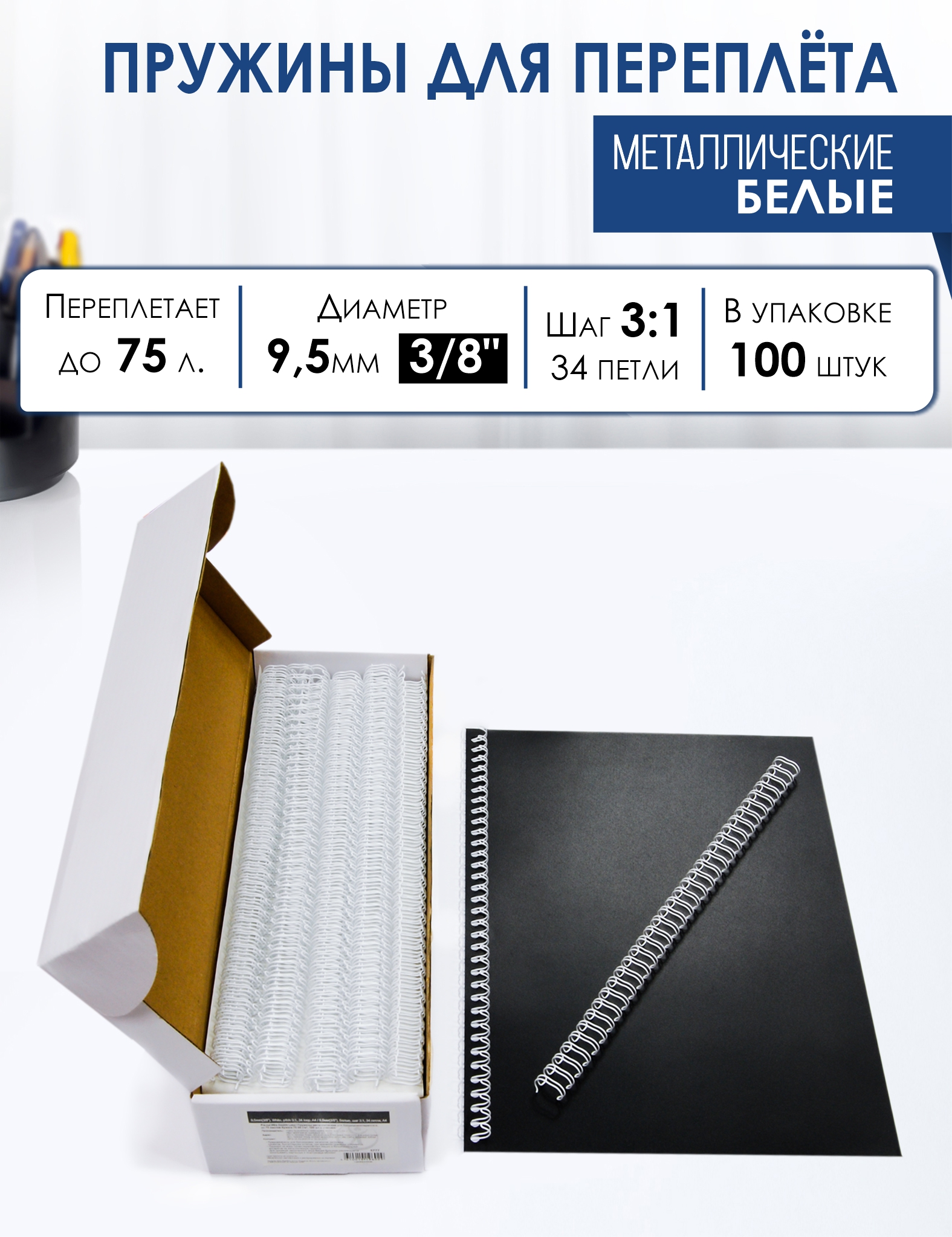 Пружины металлические, А4, 9,5мм (3/8"), белые, 100 шт. в упаковке