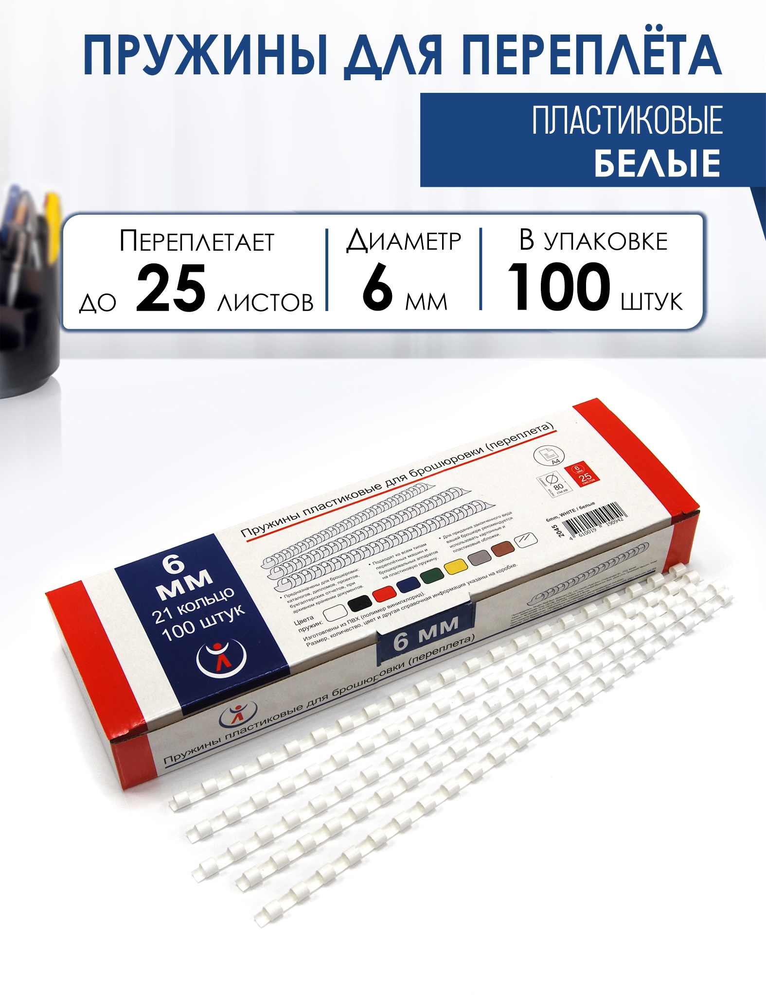 Пружины пластиковые диаметр 6мм, белые, для переплета или брошюровки - предназначены для быстрого и удобного переплета документов, каталогов, дипломов и другой печатной продукции при помощи переплетной машины. Пластиковые пружины можно использовать для переплета бумаги формата А4 или А3 (по короткой стороне), а если документ меньшего размера, то пружину можно обрезать. Можно использовать пластиковые пружины и дома, сшивая, к примеру: тематические подборки рисунков или раскрасок, контурных карт, стихов, схем и даже заламинированных листьев деревьев! Переплет пластиковыми пружинами позволяет, разжав пружину, добавить или удалить листы в документ. Эти пружины подходят ко всем типам переплетных машин и брошюровальных аппаратов на пластиковую пружину. Для придания законченного вида вашей брошюре рекомендуется использовать картонные и пластиковые обложки для переплета.Основные характеристики: Диаметр - 6мм; Цвет – белый; Переплет – до 25 листов бумаги 80гр/м2; 100 штук в коробке; 21 кольцо; Материал ПВХ пластик (ПолиВинилХлорид);