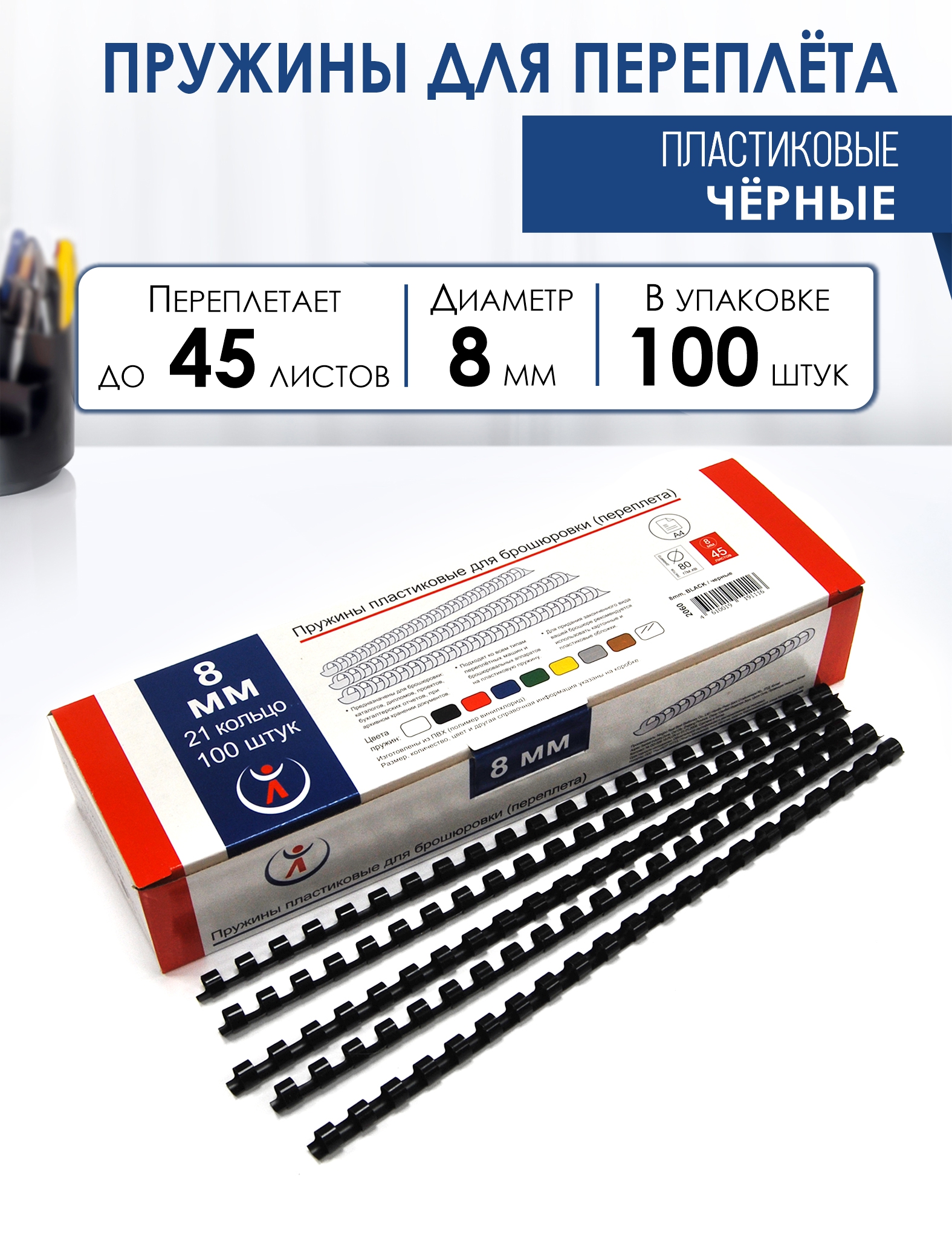 Пружины пластиковые диаметр 8мм, черные, для переплета или брошюровки - предназначены для быстрого и удобного переплета документов, каталогов, дипломов и другой печатной продукции при помощи переплетной машины. Пластиковые пружины можно использовать для переплета бумаги формата А4 или А3 (по короткой стороне), а если документ меньшего размера, то пружину можно обрезать. Можно использовать пластиковые пружины и дома, сшивая, к примеру: тематические подборки рисунков или раскрасок, контурных карт, стихов, схем и даже заламинированных листьев деревьев! Переплет пластиковыми пружинами позволяет, разжав пружину, добавить или удалить листы в документ. Эти пружины подходят ко всем типам переплетных машин и брошюровальных аппаратов на пластиковую пружину. Для придания законченного вида вашей брошюре рекомендуется использовать картонные и пластиковые обложки для переплета.Основные характеристики: Диаметр - 8мм; Цвет – черный; Переплет – до 45 листов бумаги 80гр/м2; 100 штук в коробке; 21 кольцо; Материал ПВХ пластик (ПолиВинилХлорид);
