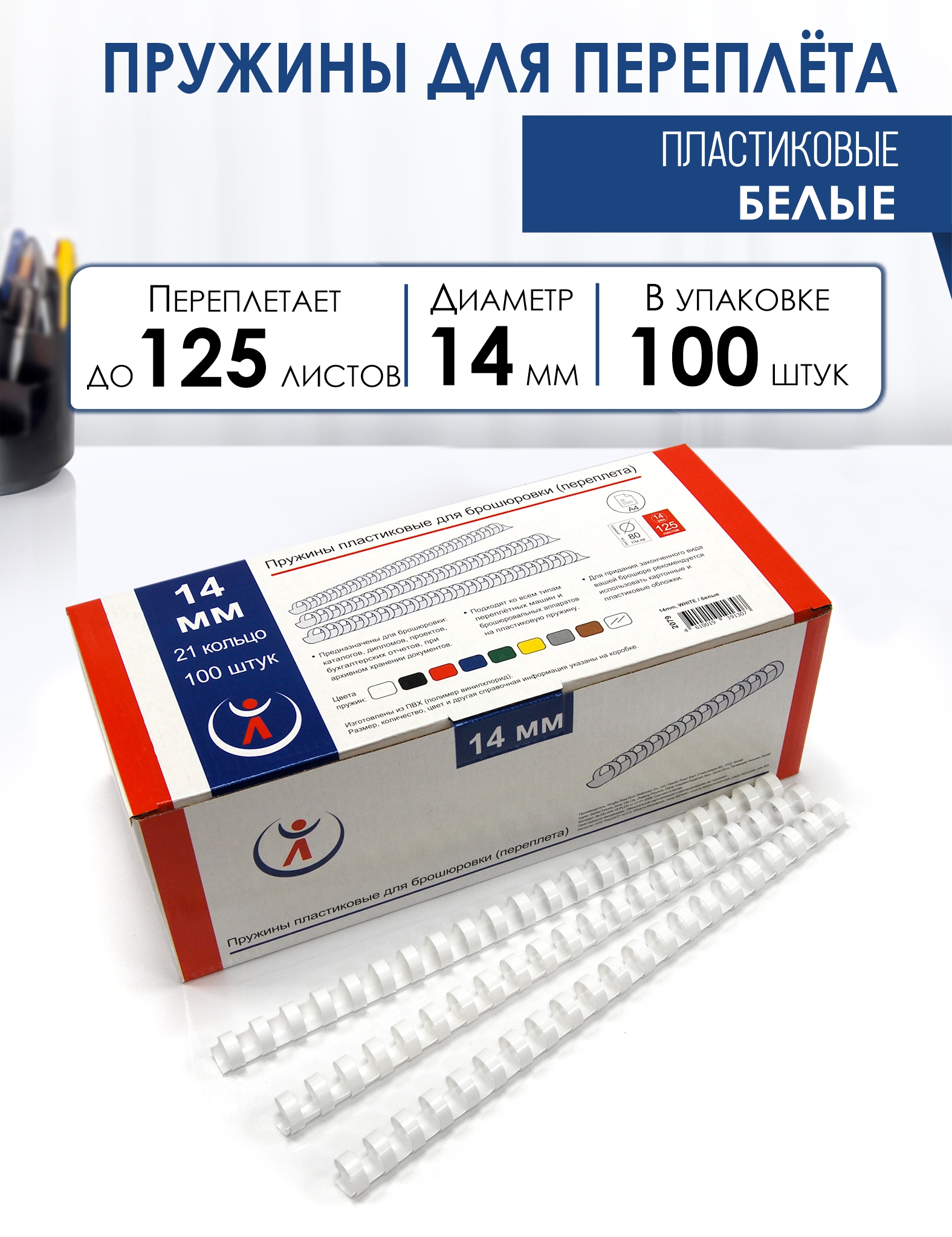 Пружины пластиковые диаметр 14мм, белые, для переплета или брошюровки - предназначены для быстрого и удобного переплета документов, каталогов, дипломов и другой печатной продукции при помощи переплетной машины. Пластиковые пружины можно использовать для переплета бумаги формата А4 или А3 (по короткой стороне), а если документ меньшего размера, то пружину можно обрезать. Можно использовать пластиковые пружины и дома, сшивая, к примеру: тематические подборки рисунков или раскрасок, контурных карт, стихов, схем и даже заламинированных листьев деревьев! Переплет пластиковыми пружинами позволяет, разжав пружину, добавить или удалить листы в документ. Эти пружины подходят ко всем типам переплетных машин и брошюровальных аппаратов на пластиковую пружину. Для придания законченного вида вашей брошюре рекомендуется использовать картонные и пластиковые обложки для переплета.Основные характеристики: Диаметр - 14мм; Цвет – белый; Переплет – до 125 листов бумаги 80гр/м2; 100 штук в коробке; 21 кольцо; Материал ПВХ пластик (ПолиВинилХлорид);