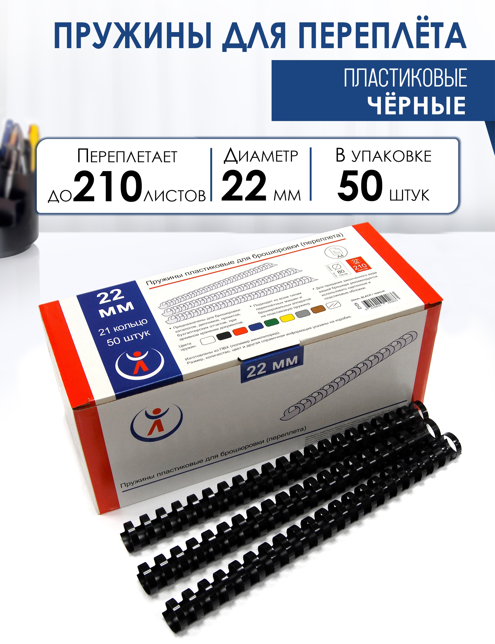Пружины пластиковые диаметр 22мм, черные, для переплета или брошюровки - предназначены для быстрого и удобного переплета документов, каталогов, дипломов и другой печатной продукции при помощи переплетной машины. Пластиковые пружины можно использовать для переплета бумаги формата А4 или А3 (по короткой стороне), а если документ меньшего размера, то пружину можно обрезать. Можно использовать пластиковые пружины и дома, сшивая, к примеру: тематические подборки рисунков или раскрасок, контурных карт, стихов, схем и даже заламинированных листьев деревьев! Переплет пластиковыми пружинами позволяет, разжав пружину, добавить или удалить листы в документ. Эти пружины подходят ко всем типам переплетных машин и брошюровальных аппаратов на пластиковую пружину. Для придания законченного вида вашей брошюре рекомендуется использовать картонные и пластиковые обложки для переплета.Основные характеристики: Диаметр - 22мм; Цвет – черный; Переплет – до 210 листов бумаги 80гр/м2; 50 штук в коробке; 21 кольцо; Материал ПВХ пластик (ПолиВинилХлорид);