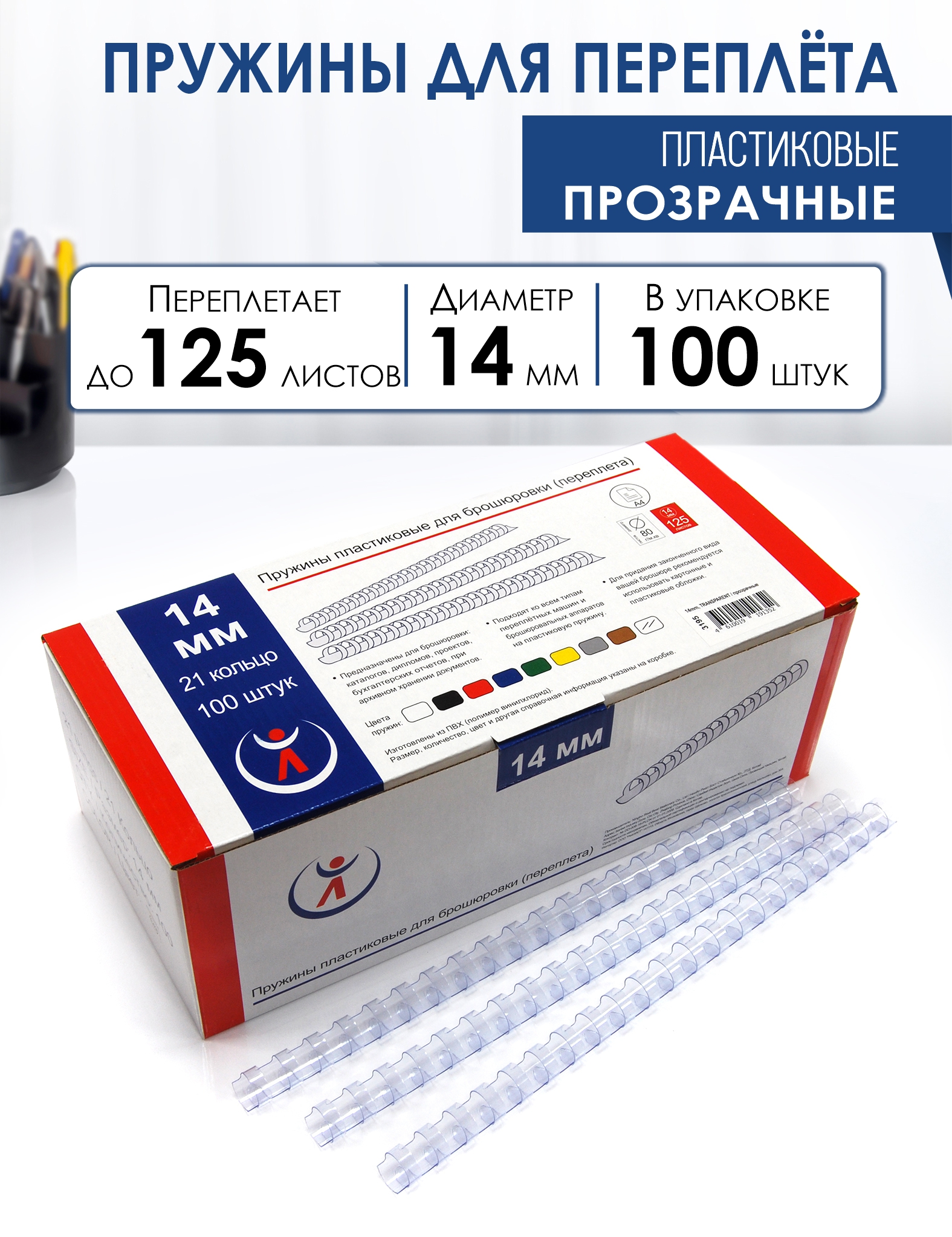 Пружины пластиковые диаметр 14мм, прозрачные, для переплета или брошюровки - предназначены для быстрого и удобного переплета документов, каталогов, дипломов и другой печатной продукции при помощи переплетной машины. Пластиковые пружины можно использовать для переплета бумаги форматом А4 или А3 (по короткой стороне), а если документ меньшего размера, то пружину можно обрезать. Можно использовать пластиковые пружины и дома, сшивая, к примеру: тематические подборки рисунков или раскрасок, контурных карт, стихов, схем и даже заламинированных листьев деревьев! Переплет пластиковыми пружинами позволяет, разжав пружину, добавить или удалить листы в документ. Эти пружины подходят ко всем типам переплетных машин и брошюровальных аппаратов на пластиковую пружину. Для придания законченного вида вашей брошюре рекомендуется использовать картонные и пластиковые обложки для переплета.Основные характеристики: Диаметр - 14мм; Цвет – бесцветный; Переплет – до 125 листов бумаги 80гр/м2; 100 штук в коробке; 21 кольцо; Материал ПВХ пластик (ПолиВинилХлорид);