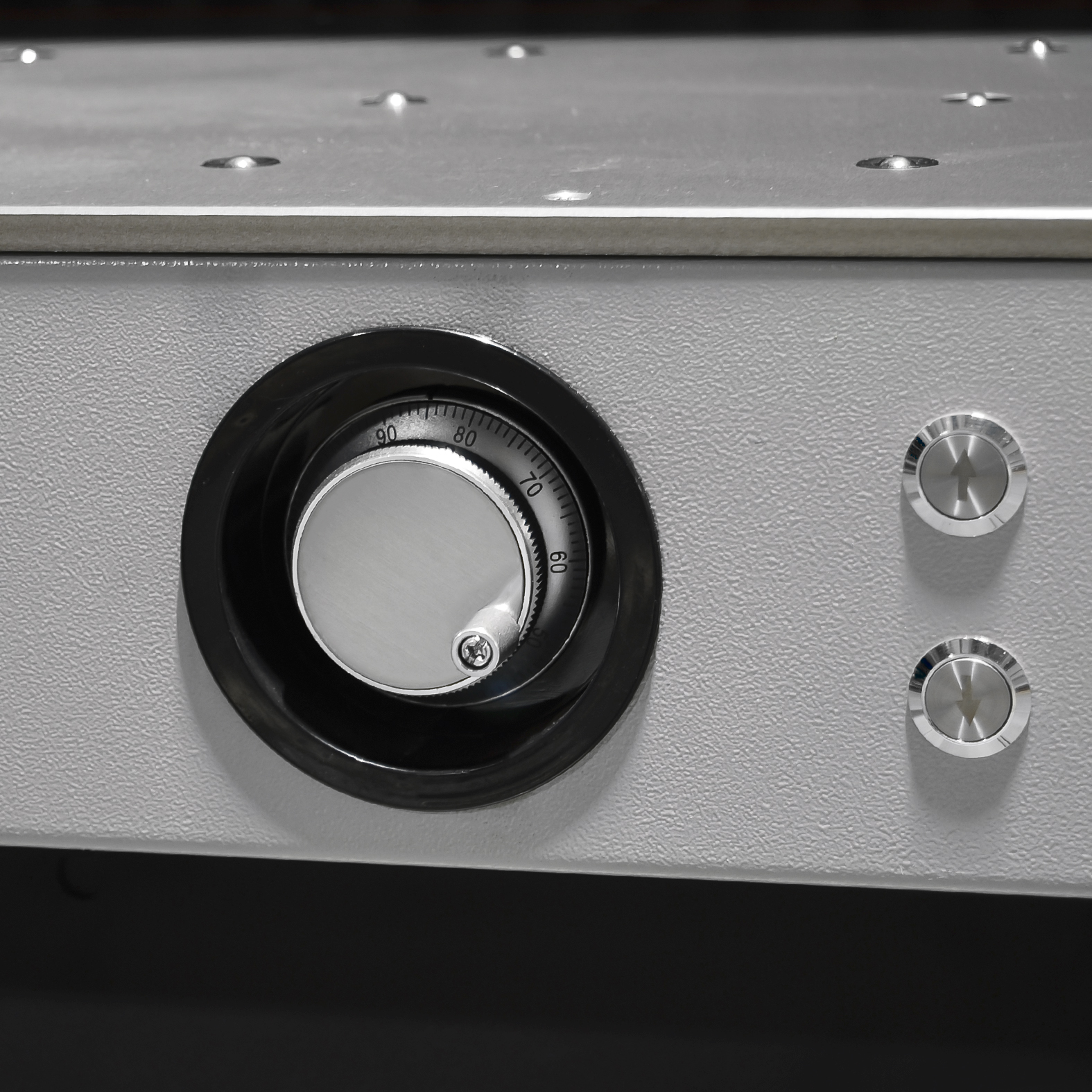 - цельнометаллическая рама, - точность позиционирования 0,2 мм, - привод затла: электрический; по центру; две направляющие по краям, - инфракрасная защита от попадания посторонних предметов в рабочую зону реза, - регулировка силы прижима от 4 mPA до 6 mPA, - независимые системы прижима и реза; отдельная кнопка прижима бумаги, - программирование реза: - 90 программ по 12 позиций реза после ножа в каждой программе, - 1 программа повторяющихся резов на два размера, - программа реза по формату А3, А4, А5, А6, по 3 реза. - полноцветный сенсорный LCD дисплей, - возможность автоматической выдачи бумаги после реза, - расширение рабочего стола на 300 мм с каждой стороны (боковые столы справа и слева), - подпружиненные шарики на рабочем столе для перемещения стопы бумаги, - педаль предварительного прижима бумаги, - регулировка ножек тумбочки по высоте. |