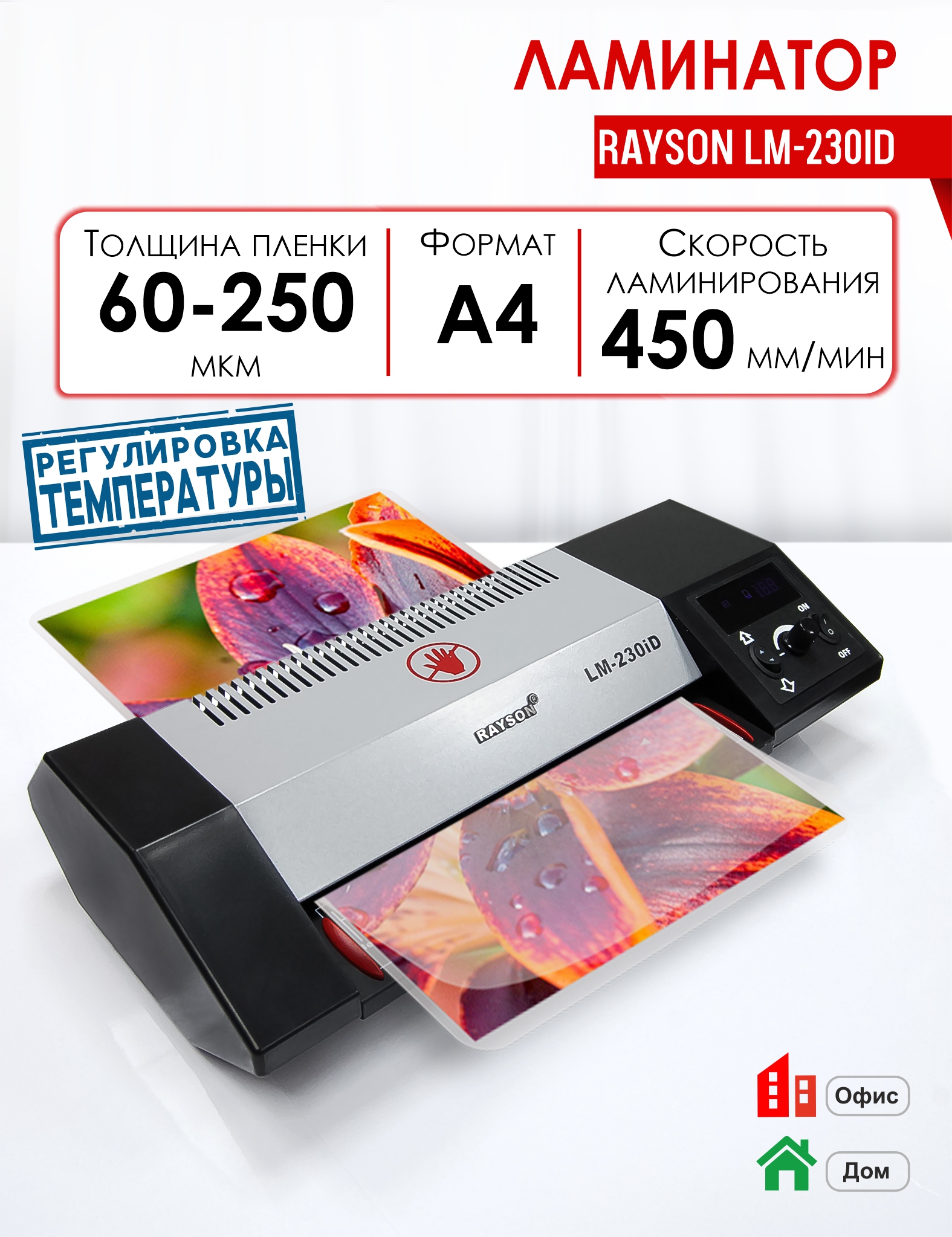 LM-230iD - пакетный ламинатор от компании Rayson. Предназначен для ламинирования печатной продукции до формата А4 включительно. Регулировка температуры с шагом в один градус, реверс, четыре вала (два из них с внешним нагревом), работает со всеми толщинами пленок. Это модель для офисов и организаций со средним объемом работ.