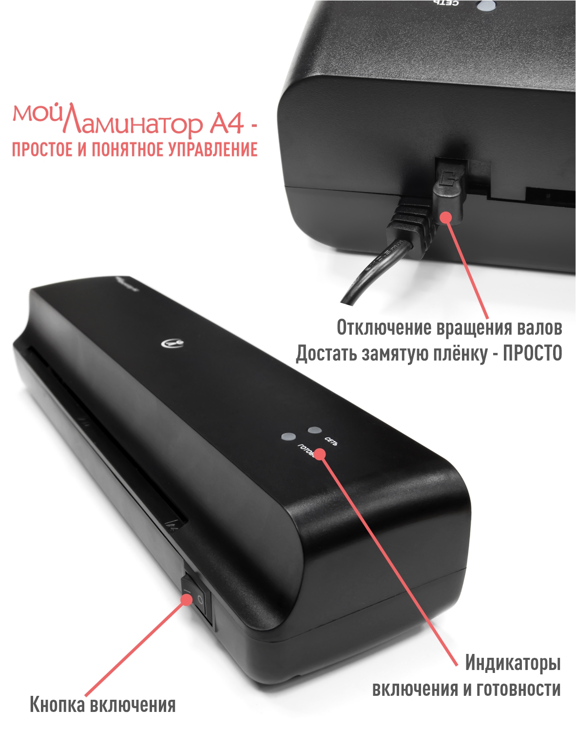 Мы услышали Вас и собрали все в МойЛаминатор A4 черного цвета: оптимальные характеристики, лаконичный дизайн, понятное управление: Формат ламинирования от 54х86 мм до A4; Толщина пленки- 75-125 мкм; Система нагрева – 2 горячих вала с внешним нагревом; Время нагрева - 3-4 минуты; Горячее ламинирование - Да; Скорость ламинирования - 300 мм/мин; Ширина ламинирования - 235 мм; Толщина ламинирования - до 1,0 мм; Управление одной кнопкой – Вкл/Выкл; Индикаторы - питание включено, готов к работе; Рычаг отключения вращения валов в случае замятия заготовки; Мощность – 280 Вт.