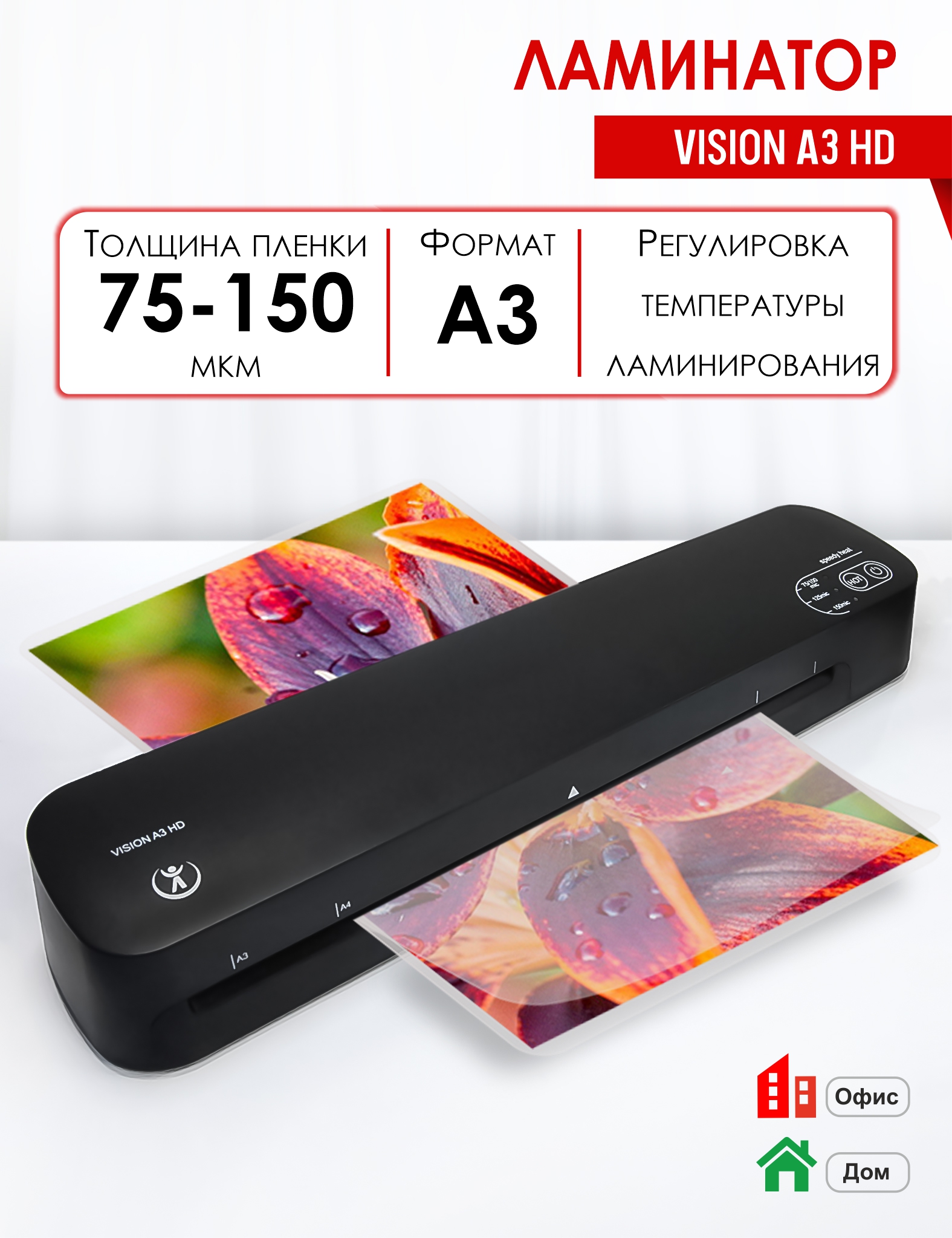 Vision A3 HD предназначен для ламинирования объявлений, указателей, меню, пропусков, бэджей и другой печатной продукции. Отличный выбор для дома, офисов и организаций с небольшим объемом работ.