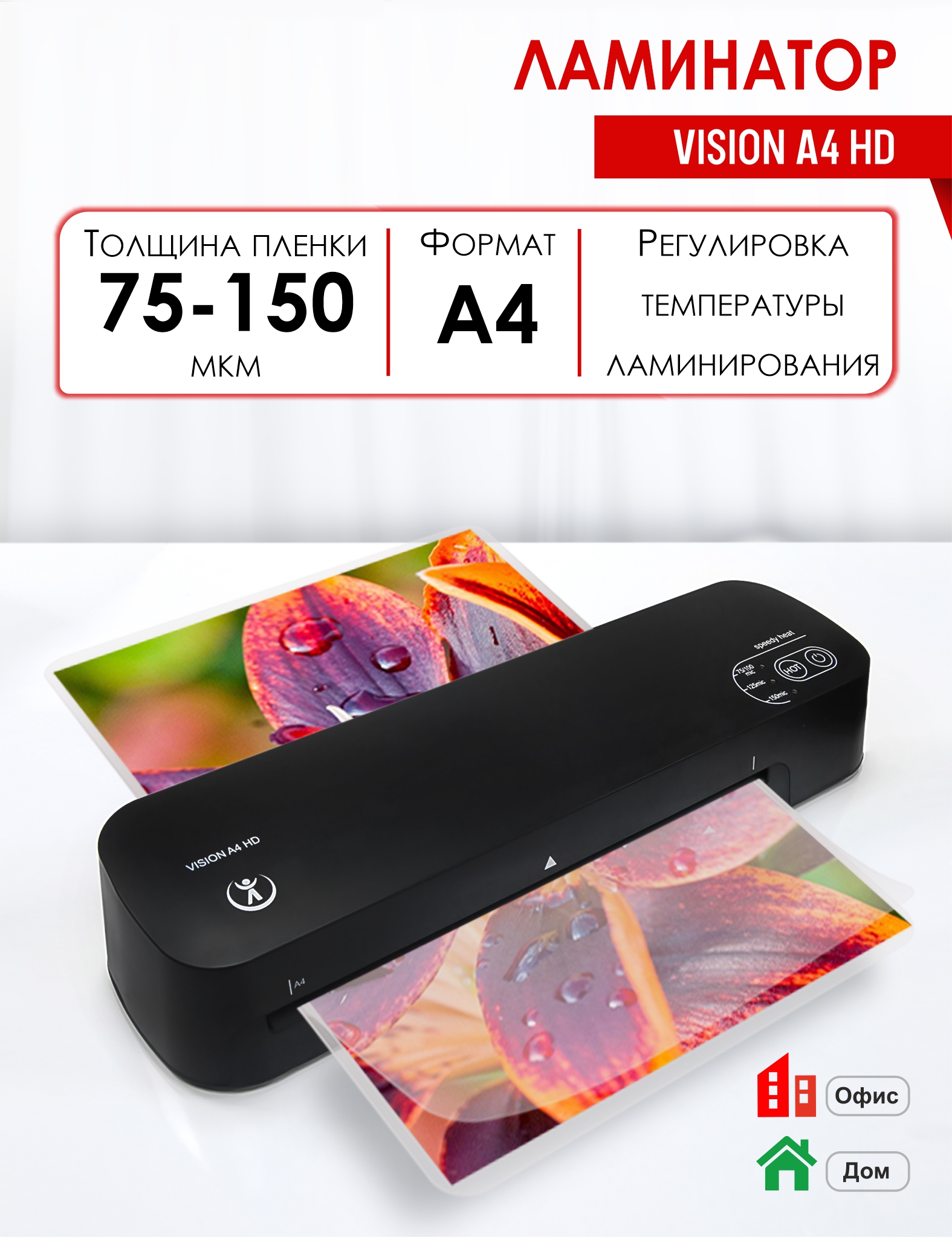 Vision A4 HD предназначен для ламинирования объявлений, указателей, меню, пропусков, бэджей и другой печатной продукции. Отличный выбор для дома, офисов и организаций с небольшим объемом работ.