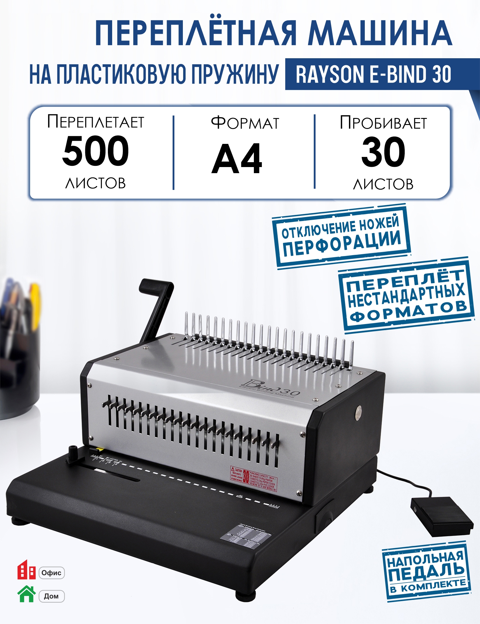 E-BIND 30 – переплетная машинка на пластиковую пружину от компании Rayson. Мощный брошюратор с электрическим приводом механизма перфорации бумаги и напольной педалью управления, с помощью которой можно переплести до 500 листов. E-BIND 30 часто покупают типографии и офисы со средним и большим объемом работ.