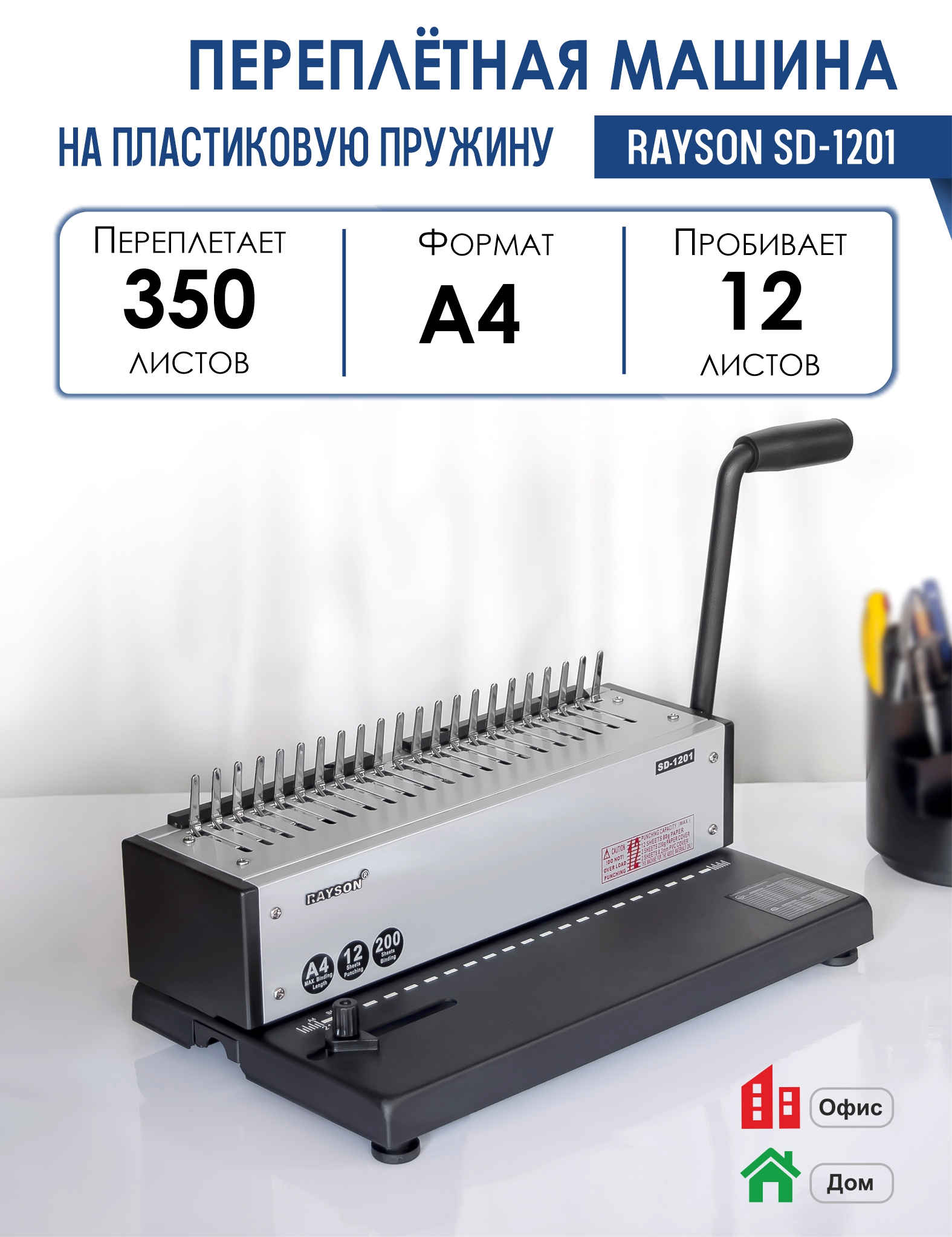 SD-1201 – переплетная машина на пластиковую пружину от компании Rayson. Бюджетный вариант брошюратора, с помощью которого можно переплести до 350 листов бумаги. SD-1201 отлично подходит для организаций и офисов с небольшим объемом работ.