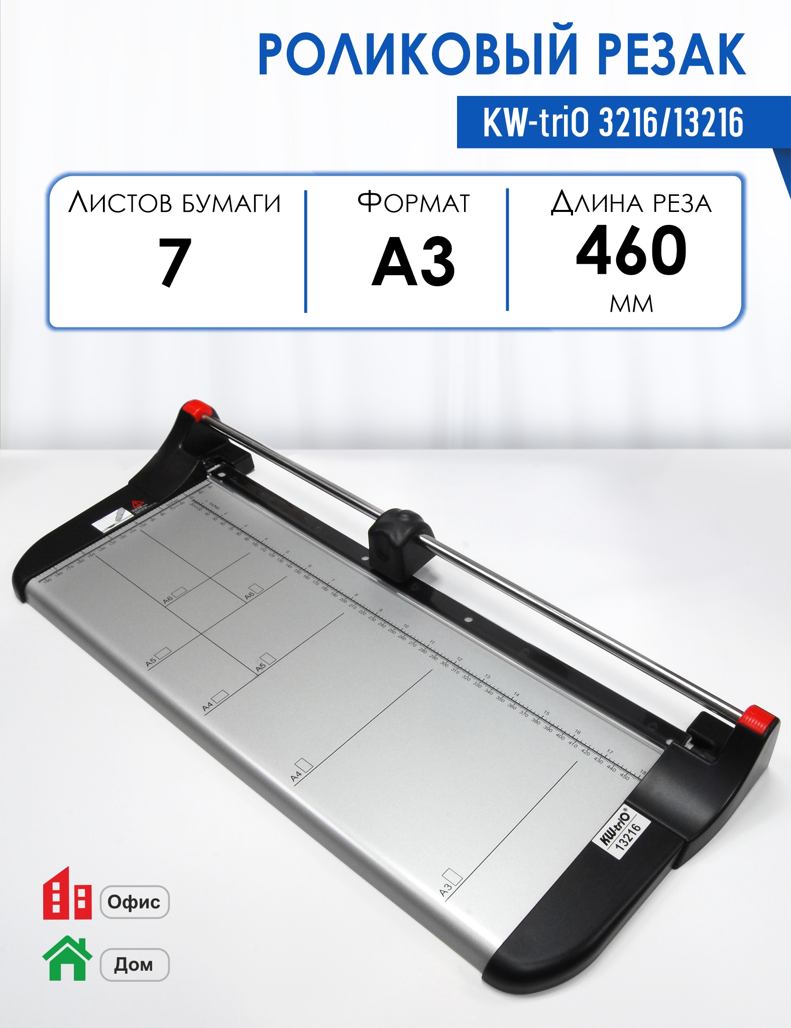 Компактный роликовый резак формата A3 от компании KW-triO. KW-triO 3216 (или KW-triO 13216) - недорогая модель с металлическим столом, удобной разметкой и автоматическим прижимом стопы бумаги во время реза для максимального удобства. Для офисов и организаций с небольшим объемом работ.