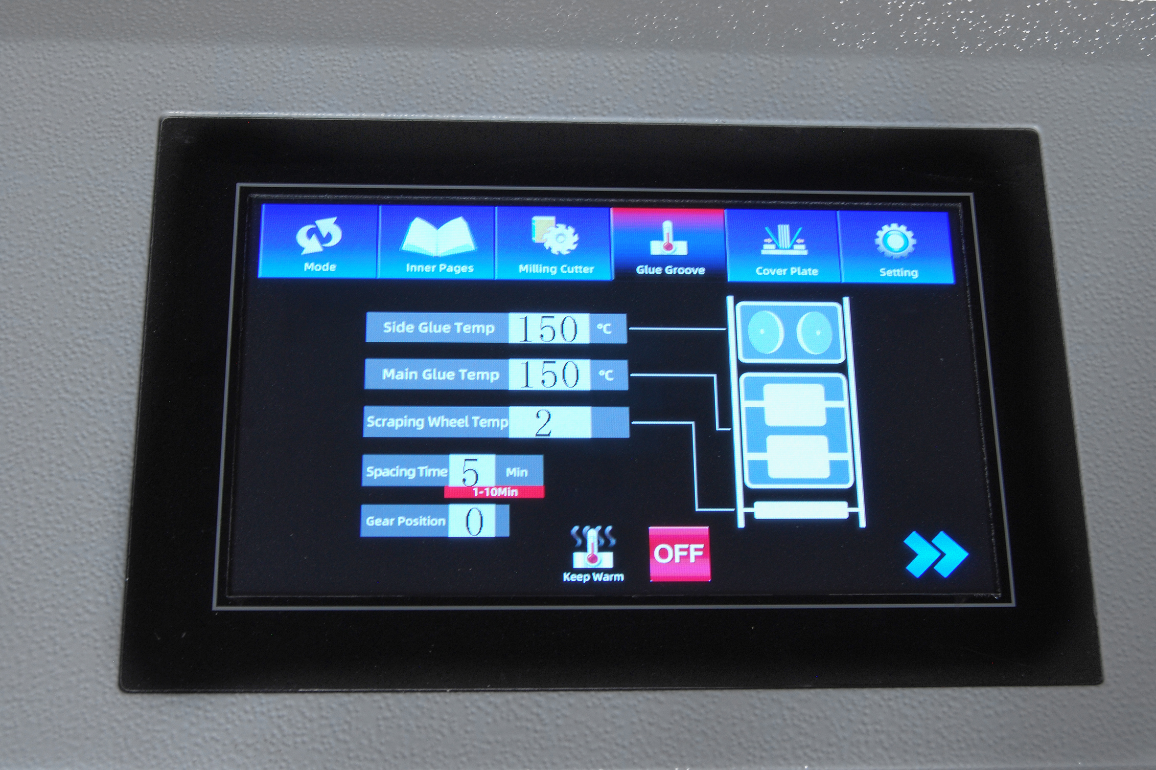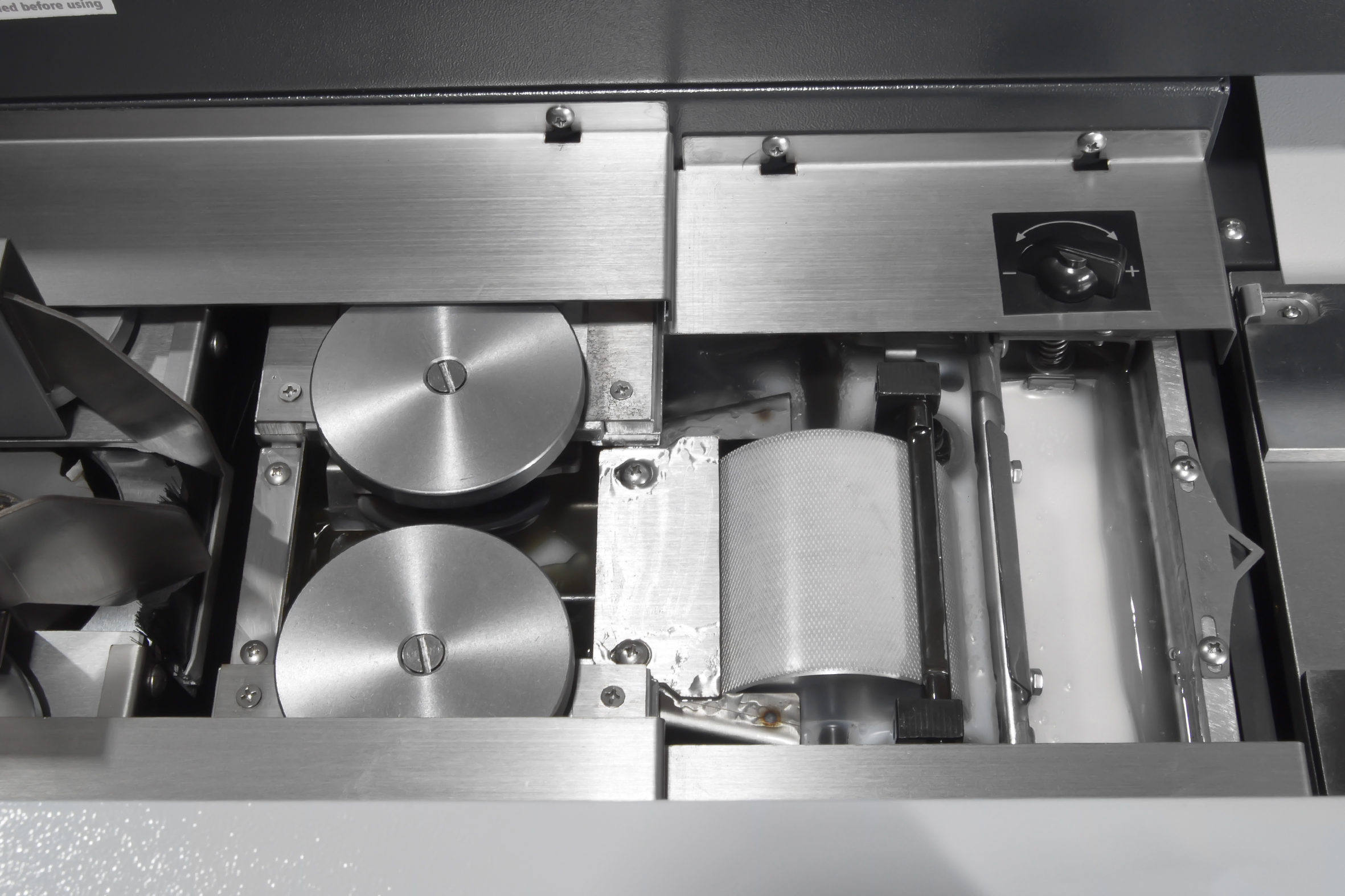 - Ролики боковой проклейки имеют свою отдельную клеевую ванну, с отдельным нагревателем, термостатом, датчиком температуры. Благодаря этому вы можете использовать разные типы клеев с разной рабочей температурой для проклейки корешка и боковой проклейки;