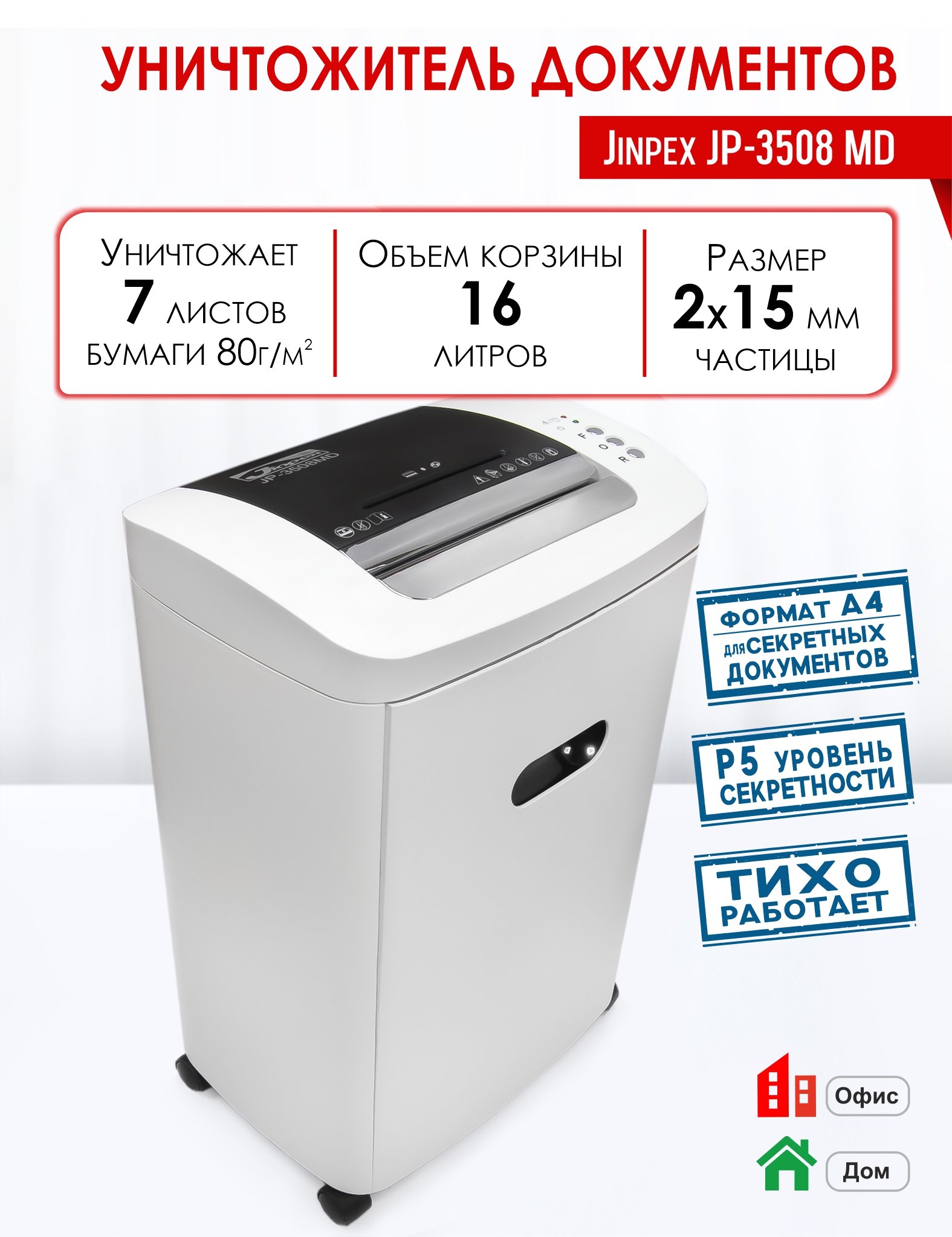 Уничтожитель документов JP-3508MD от компании Jinpex подходит для небольших компаний и групп пользователей. Дизайн модели очень удачный, матовый светлый пластик, темная вставка сверху и немного хрома, отлично подходит для любого офиса. Уничтожитель режет бумагу кусочками 2,0х15мм, так же уничтожает кредитные карты, диски DVD/CD, степлерные скобы, имеются ролики для передвижения уничтожителя. Смотровое окно позволяет видеть уровень заполнения корзины. Легким движением корзина вынимается и удаляются отходы. Степень секретности Р5 высокая - Документы с конфиденциальной информацией фундаментальной важности для человека, компании или учреждения.
