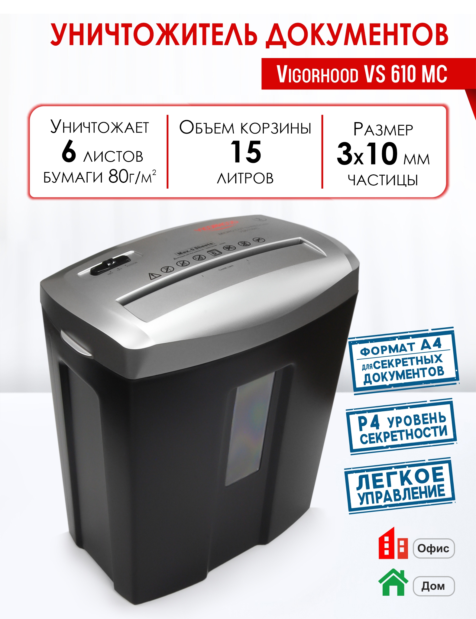 Vigorhood VS610MC - уничтожитель повышенной степени секретности (P-4) для документов с очень уязвимыми и конфиденциальными данными, а также персональными данными.